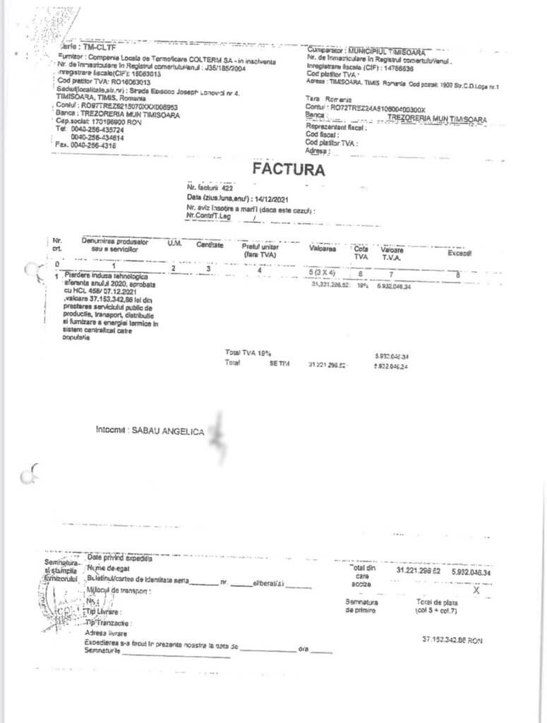 Etapa 2 – Primăria obligă COLTERM să emită facturi… în alt scop. Practic, departamentul contabil al Primăriei transmite COLTERM ce să factureze (subvenție diferență de preț la energia termică livrată populației), refuză recepția oricărei facturi pentru consumul de gaze, returnează facturile care respectau legea.