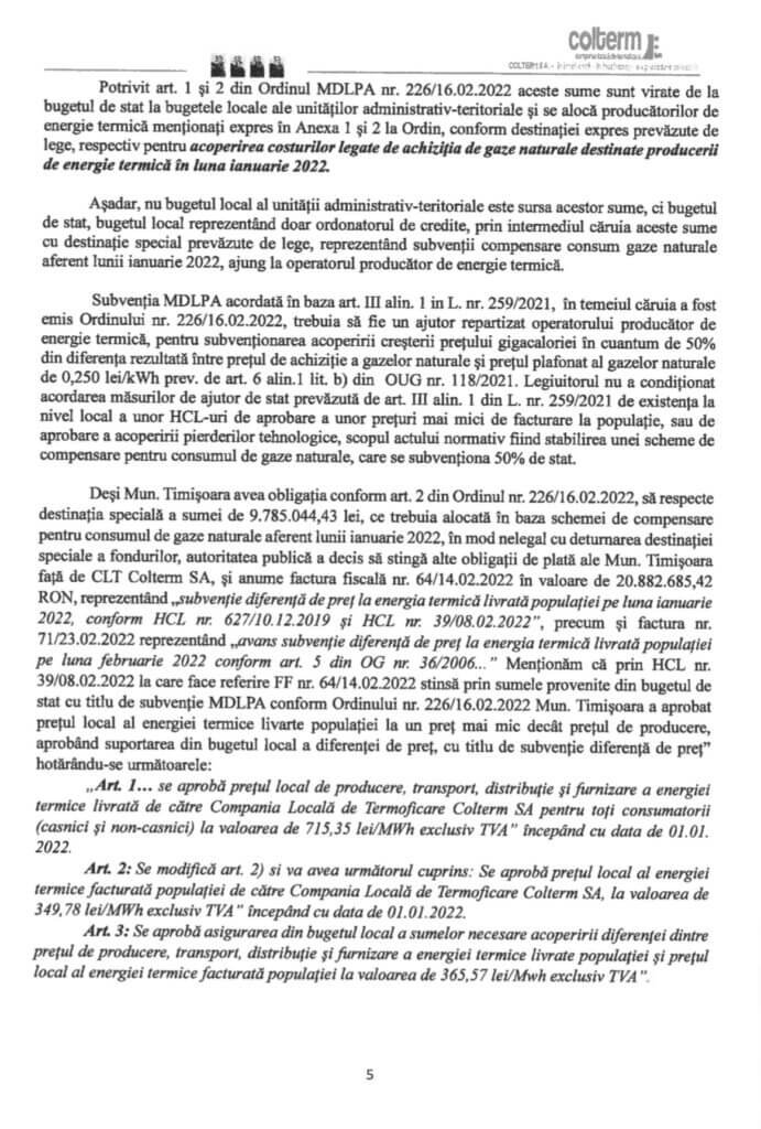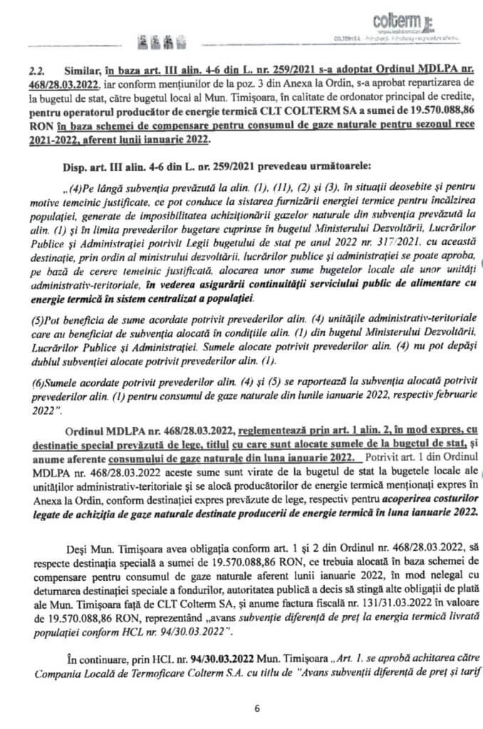 Nu de alta, dar responsabilitățile legale directe ale edilului, conform Legii nr. 273/2006 privind finanțele publice locale, sunt aprobarea plăților din bugetul local, corecta utilizare a sumelor provenite din bugetul de stat și răspunderea pentru plata subvențiilor cu destinație specială către operatori. Or, în cererea de chemare în judecată a Consiliului Local Timișoara, în calitate de unic acționar al COLTERM, operatorul de termoficare indică, în mod constant, informația că primarul a aprobat utilizarea subvențiilor MDLPA pentru altceva decât destinația legală. Și, mai mult, că acesta nu poate delega răspunderea juridică pentru deturnarea destinației fondurilor: