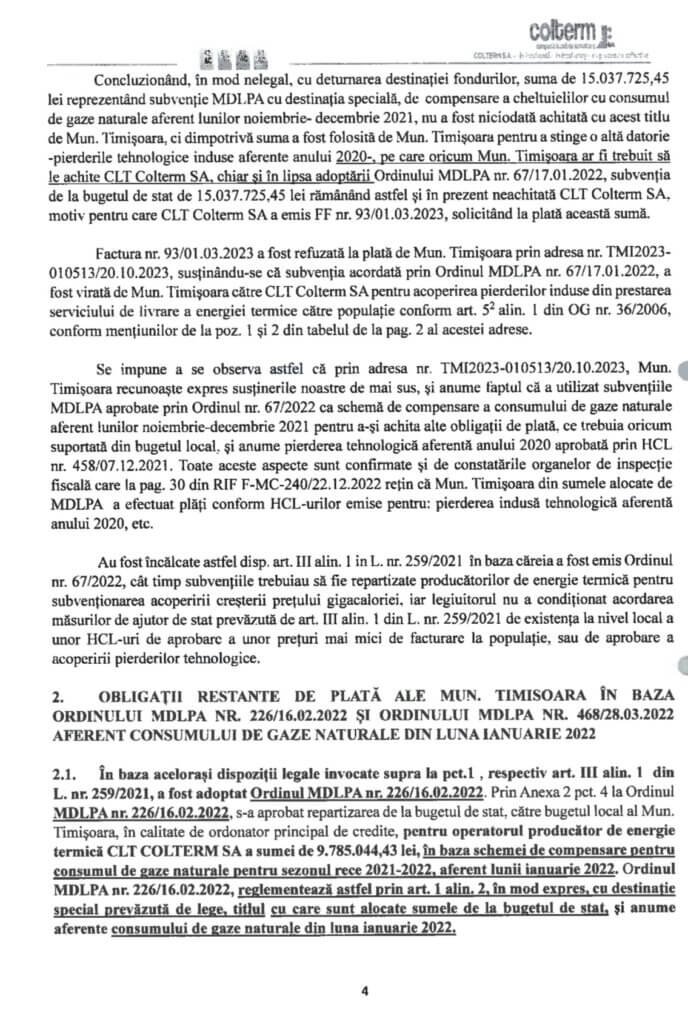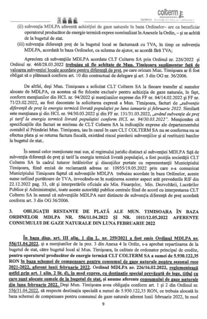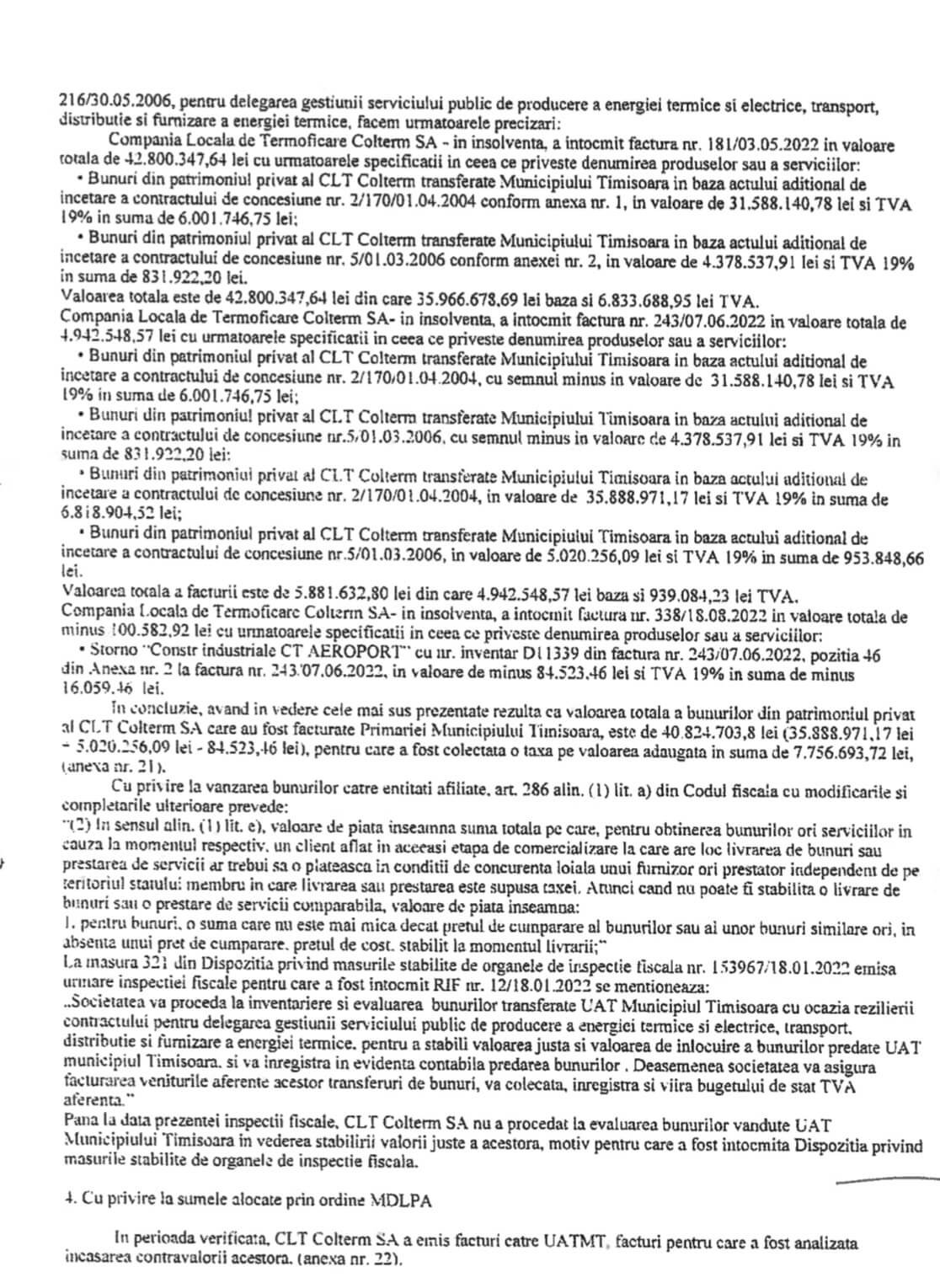 Că lucrurile stau întocmai, dacă mai era nevoie, o confirmă și Curtea de Conturi care, în scris, a subliniat că NU există nicio dovadă de plată că banii MDLPA au ajuns în conturile COLTERM. Ceea ce, în procedura fiscală, echivalează cu inexistența plății! Mai mult, chiar și Ministerul Finanțelor, într-o corespondență internă cu Primăria Timișoara, a atras atenția că subvențiile MDLPA sunt fără TVA și… cu destinație fixă. Adică, nu nu pot fi utilizate pentru pierderi tehnologice și că destinația banilor este exclusiv achiziția gazelor naturale. Și toate aceste aspecte sunt consemnate, pe larg, la pag. 17–20, în raportul de inspecție fiscală ANAF. Negru pe alb!