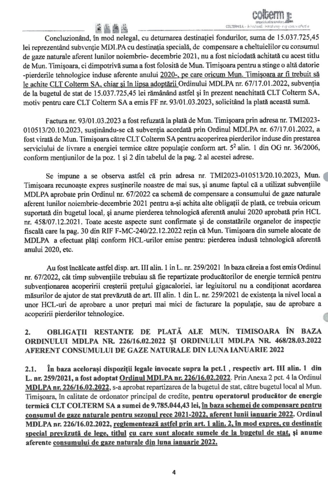 NU să modifice, NU să rețină și NICI să redirecționeze sumele primite de la Guvern, în alte scopuri decât cele prevăzute de ordinele MDLPA. Adică, pe subvenția de gigacalorie! În schimb, documentele intrate în posesia InsiderTM arată cu totul altceva. De fapt, o spectaculoasă deturnare a destinației fondurilor guvernamentale! Și asta pentru că, în paginile dosarului de instanță, prin care a cerut plata de urgență a datoriilor, invocând riscul iminent al falimentului, COLTERM arată detaliat că Primăria Timișoara a obligat societatea să emită facturi care nu aveau legătură cu achiziția gazelor naturale, singura destinație legală a sumelor provenite din subvențiile MDLPA.