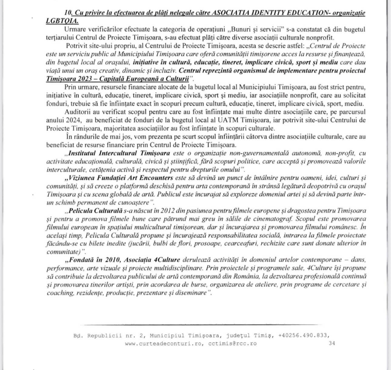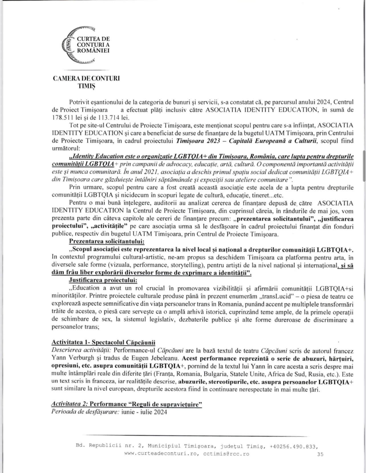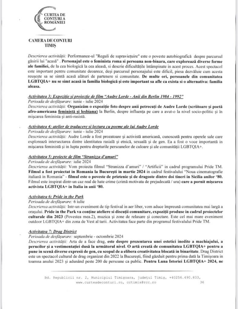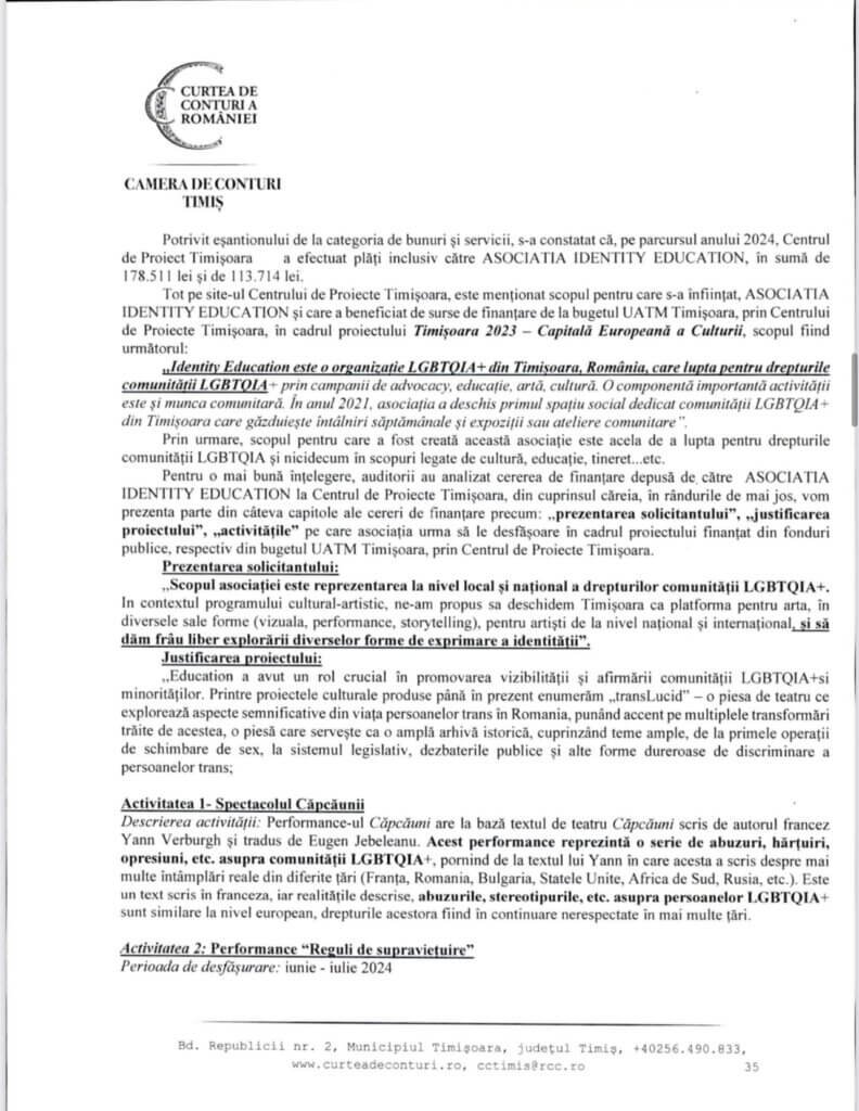 Și partea frumoasă e că au fost chiar două finanțări zdravene. Una de 178.511 lei și alta de 113.714 lei, plus alte tranșe care duc totalul la 391.685 lei. Ce mai, bani frumos transfigurați în spectacole cu căpcăuni, performance-uri autobiografice, proiecte cu Audre Lorde și un festival Pride in the Park, unde probabil cultură se găsea doar la standul cu hamsii (dacă era). În realitate, așa cum au pus pe hârtie auditorii Camerei de Conturi Timiș, cultura a fost acolo exact cât e și oregano într-o șaormă! Acum, potrivit legii, finanțările trebuiau alocate pentru cultură, educație, tineret, implicare civică, sport și mediu. Doar că, potrivit solicitantului, scopul declarat a fost acela de… reprezentare a drepturilor comunității LGBTQIA+ la nivel local. O diferență la fel de mare ca între un festival de colinde și un concert Marilyn Manson.