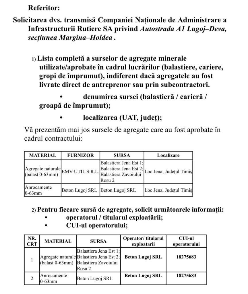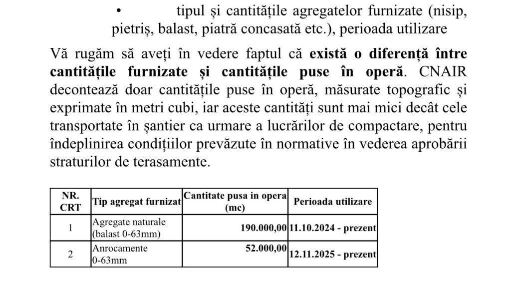 Și, așa cum rezultă din documente, de când a pornit lucrarea (2024) și până la data comunicării CNAIR pe Legea 544/2001 (februarie 2026), cantitățile de agregate minerale, livrate către cei de la UMB–Tehnostrade–SA&PE, nu au fost simbolice și nici marginale. Practic vorbim de aproximativ 190.000 de metri cubi de balast și peste 50.000 de metri cubi de anrocamente, toate puse în operă și decontate. La asemenea volume, orice adaos și oricât de mic, devine o afacere serioasă, iar orice verigă suplimentară din lanțul de aprovizionare nu mai este un detaliu tehnic, ci o decizie cu impact financiar major.