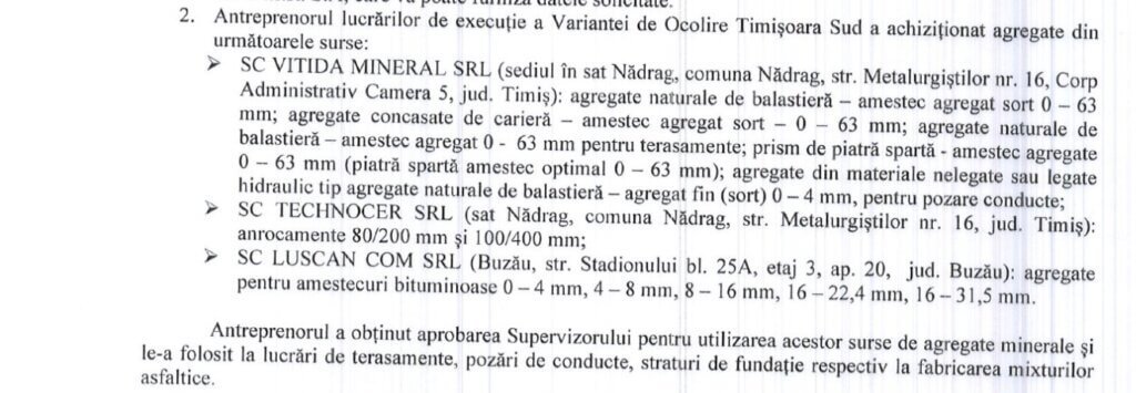 De fapt, spre deosebire de către cei de la CNAIR, DRDP Timișoara a fost mult mai secretoasă. Practic, a confirmat oficial doar că la execuția lucrărilor de la Varianta de Ocolire Timișoara Sud au fost folosite agregate de la trei balastiere, operate de SC Vitida Mineral SRL, SC Tehnocer SRL și SC Luscan Com SRL. În schimb, nu a dezvăluit care sunt firmele care au livrat materie primă către asocierea SA&PE Construct SRL (lider), Spedition UMB și Tehnostrade SRL. Altfel spus, deși documentele de trasabilitate și conformitate există, spre deosebire de mai marii lor de la CNAIR, cei de la DRDP Timiș a considerat că informațiile ar conține date comerciale confidențiale. Practic, statul știe exact cine a livrat, cât a livrat și în ce condiții, dar consideră că cetățeanul, care a plătit lucrarea, nu are dreptul să vadă acest lanț economic, până la capăt.
