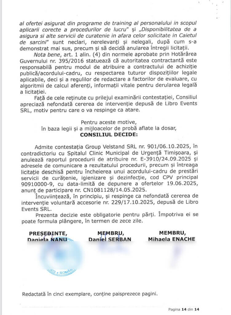 Așadar, pe data de 21 noiembrie 2025, o licitație de peste 5,3 milioane de lei pentru serviciile de curățenie ale Spitalului Clinic Municipal de Urgență Timișoara a fost anulată complet de Consiliul Național de Soluționare a Contestațiilor (CNSC). Așa cum rezultă din documente, motivele sunt legate de încălcări grave ale legii, criterii de evaluare imposibil de aplicat, punctaje acordate arbitrar, documentație redactată deficitar și lipsa oricărei posibilități de remediere ulterioară. Adevărul e că decizia CNSC nr. 3361/C4/3931, care se întinde pe vreo 14 pagini, este absolut devastatoare pentru spital și nu face decât să se înscrie într-o serie de noi eșecuri administrative.