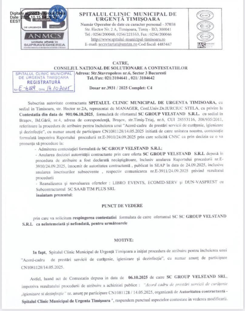 - ETAPA 6 – Apărarea spitalului, 14 octombrie 2025. SCMUT transmite CNSC punctul său de vedere și cere respingerea contestației, considerând procedura… corectă.