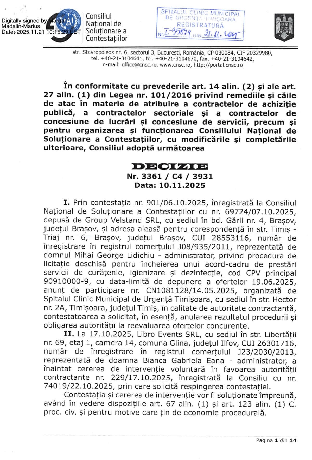 Așadar, pe data de 21 noiembrie 2025, o licitație de peste 5,3 milioane de lei pentru serviciile de curățenie ale Spitalului Clinic Municipal de Urgență Timișoara a fost anulată complet de Consiliul Național de Soluționare a Contestațiilor (CNSC). Așa cum rezultă din documente, motivele sunt legate de încălcări grave ale legii, criterii de evaluare imposibil de aplicat, punctaje acordate arbitrar, documentație redactată deficitar și lipsa oricărei posibilități de remediere ulterioară. Adevărul e că decizia CNSC nr. 3361/C4/3931, care se întinde pe vreo 14 pagini, este absolut devastatoare pentru spital și nu face decât să se înscrie într-o serie de noi eșecuri administrative.