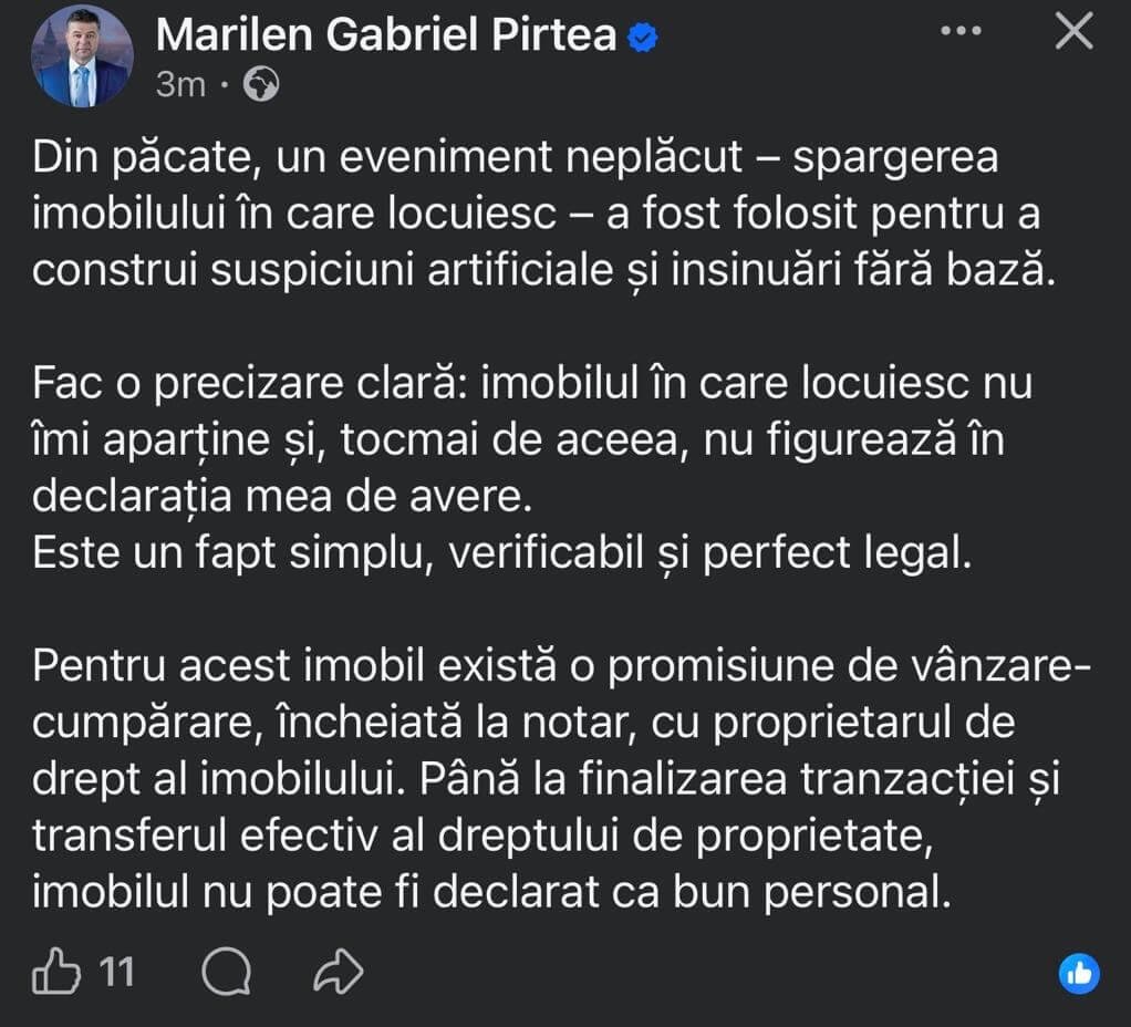 Din păcate, un eveniment neplăcut – spargerea imobilului în care locuiesc – a fost folosit pentru a construi suspiciuni artificiale și insinuări fără bază. Fac o precizare clară: imobilul în care locuiesc nu îmi aparține și, tocmai de aceea, nu figurează în declarația mea de avere. Este un fapt simplu, verificabil și perfect legal. Pentru acest imobil există o promisiune de vânzare-cumpărare, încheiată la notar, cu proprietarul de drept al imobilului. Până la finalizarea tranzacției și transferul efectiv al dreptului de proprietate, imobilul nu poate fi declarat ca bun personal.