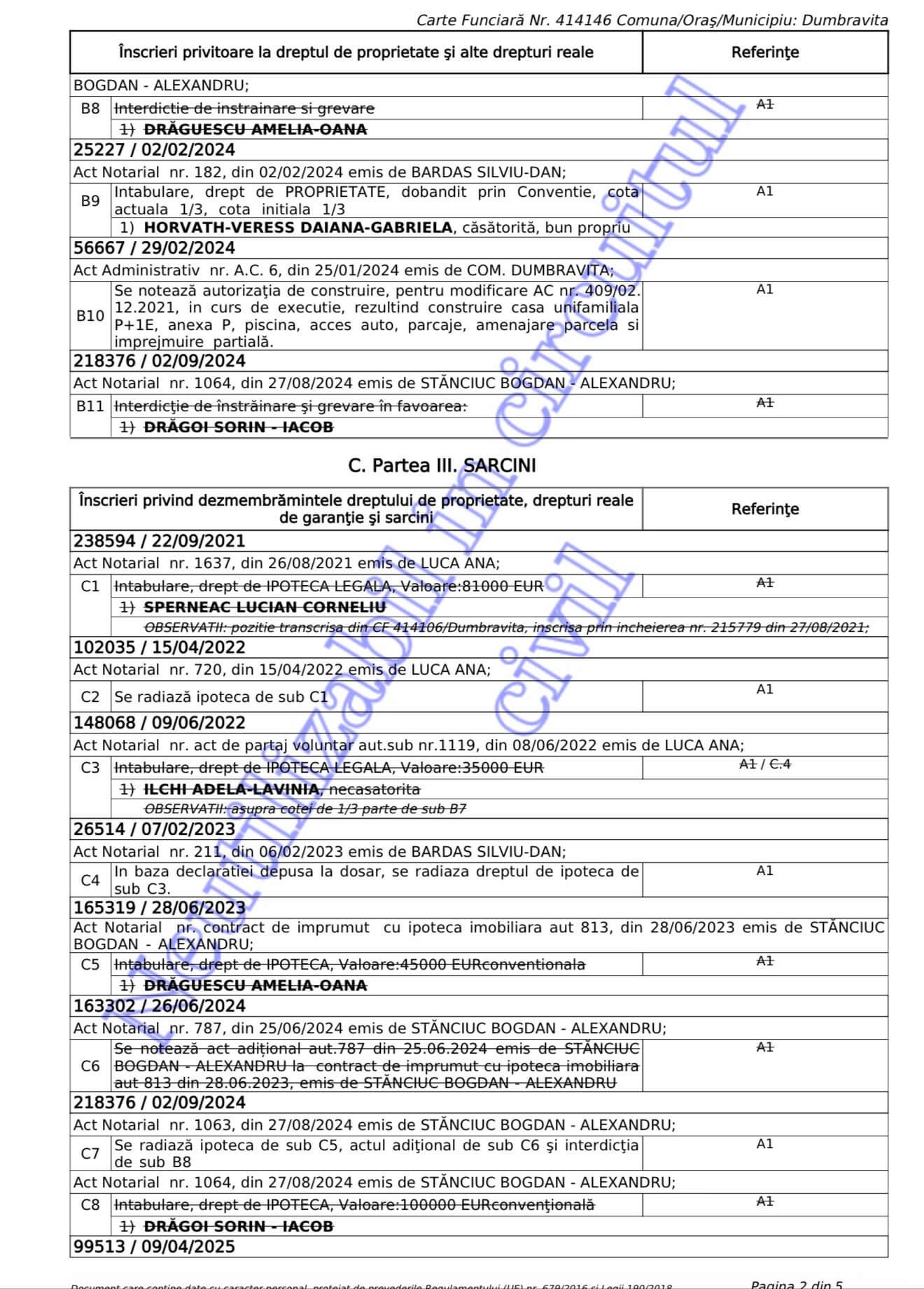 Așadar, fără un imobil intabulat, dar locuit încă din 2023 (conform imaginilor de pe Google Earth), e limpede că, nici la data la care rectorul UVT a ocupat imobilul (și a început să plătească utilitățile!) și nici azi, după spargerea din 24 ianuarie a.c, în cartea funciară a terenului (CF 414146) nu a existat și nu există nicio mențiune referitoare la vreo promisiune de vânzare-cumpărare. Sau orice alt înscris tabular care să lămurească, dincolo de orice taxe și impuneri pe clădire, condițiile legale în care Marilen Pirtea ocupă imobilul de pe strada Luceafărului din Dumbrăvița. Ceea ce este absolut neobișnuit pentru că, în caz de litigiu, rectorul UVT ar fi obligat să ceară fie executarea silită a promisiunii bilaterale (dacă există!), fie recuperarea banilor, pe care se presupune că i-a dat ca avans, atât la intrarea în casă, cât și după instalare in sufragerie.
