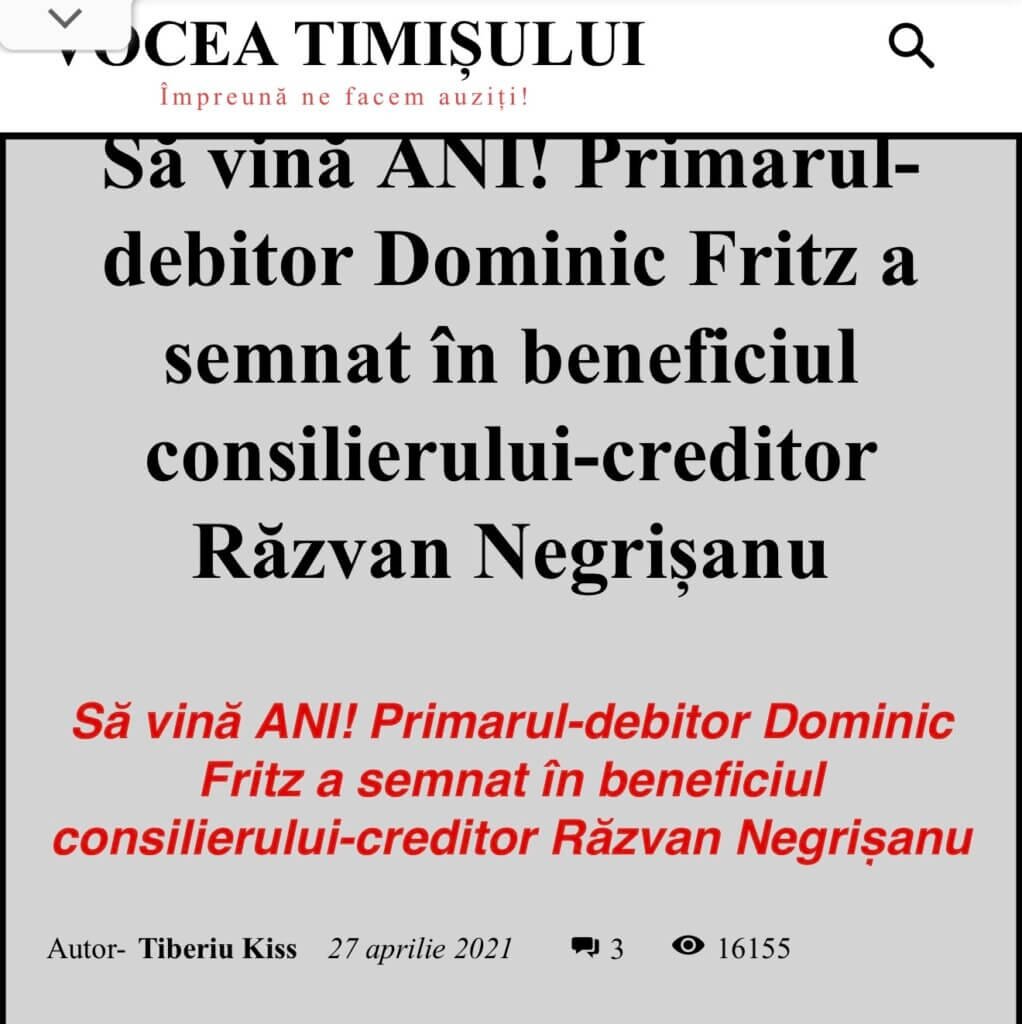 Așadar, după cum rezultă din declarația sa de avere, depusă pe site-ul Primăriei municipiului Timișoara, la data de 6 noiembrie 2020, consilierul local Răzvan-Gabriel Negrișanu, reprezentant USR Timiș, l-a împrumutat pe primarul Dominic Samuel Fritz cu suma de 25.000 RON, în nume personal. La rândul său, edilul Timișoarei, în declarația sa de avere, înregistrată în 20 ianuarie 2021, deși secretizată, confirmă un ”împrumut campanie electorală”, în sumă de 25.000 RON, debit scadent până la finele anului în curs.