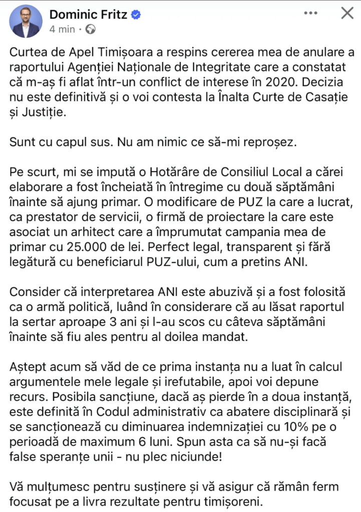 Instanța s-a pronunțat, azi, în dosarul în care primarul Dominic Fritz a contestat raportul Agenției Naționale de Integritate, instituție care l-a declarat în conflict de interese, după o cercetare care a durat mai bine de 3 ani. Judecătorii de la Curtea de Apel Timișoara au dat câștig de cauză ANI și au respins solicitarea edilului de anulare a raportului de evaluare. Primarul are la dispoziție 15 zile pentru a ataca hotărârea cu recurs.