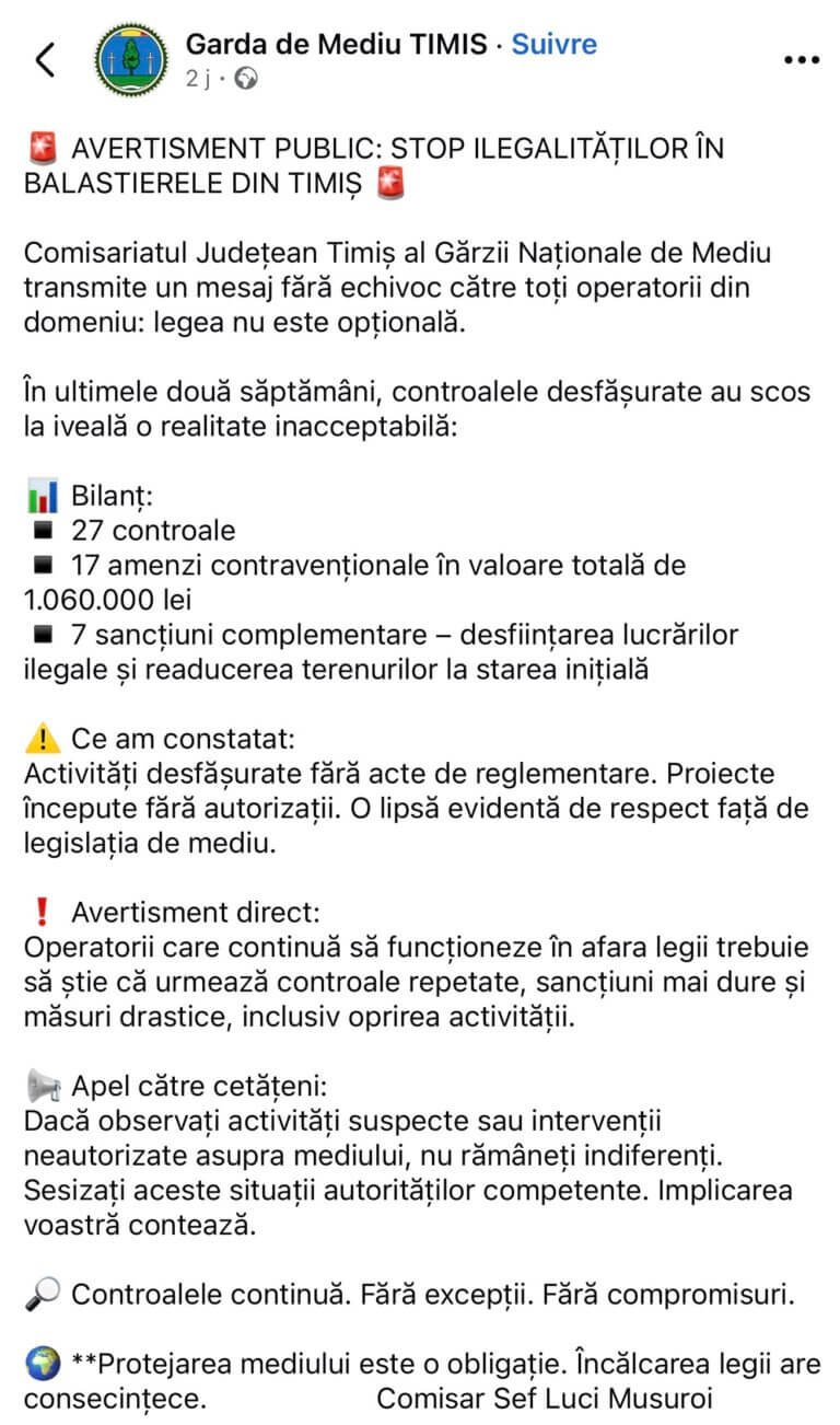 În plin scandal al exploatărilor ilegale de agregate minerale din Banat, pe pagina oficială de Facebook, Comisariatul Județean Timiș al Gărzii Naționale de Mediu a semnalizat că (încă!) mai există! Nu doar că instituția a transmis că respiră și e funcțională, ci și că, odată cu glasul, i-au revenit și mușchii. Așa se explică, de fapt, dublul mesaj al autorității, care a fost aruncat în online, sub forma unui avertismentpublic, în direcția tuturor operatorilor de resurse ale subsolului. Practic, o postare care transmite tot atâtea idei – Stop ilegalităților în balastierele din Timiș/Legea nu este opțională! Doar că, în loc de tremurat și transpirații reci, reacția revoluționară a Gărzii de Mediu a stârnit un val de râsete și comentarii negative, atât în mediul virtual, cât și pe piața liberă de profil.