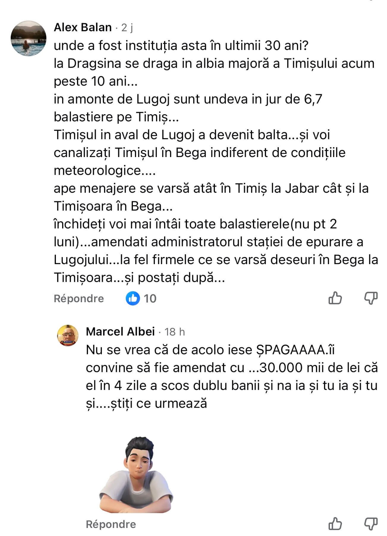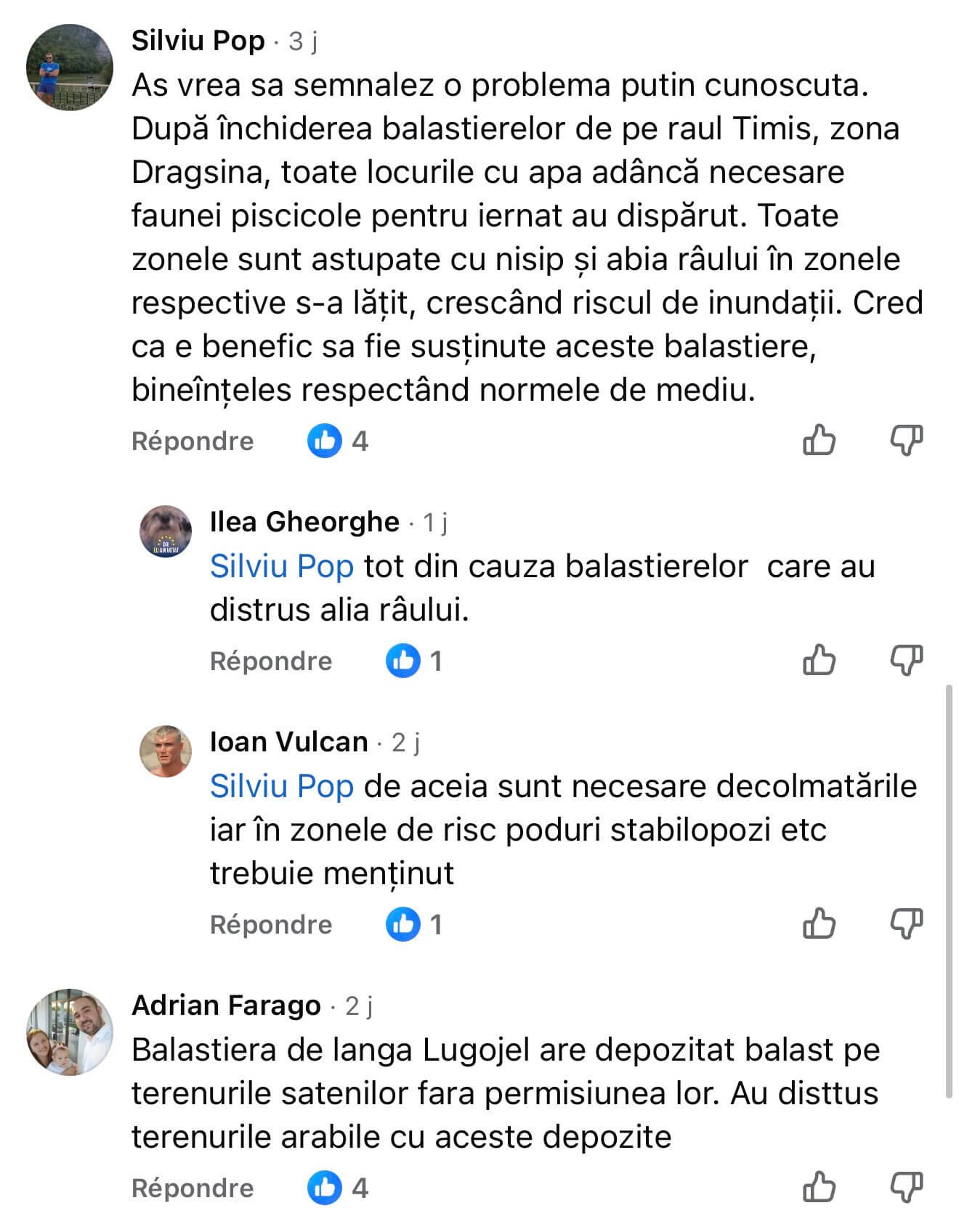 Și marea majoritatea a nemulțumirilor timișenilor, așa cum rezultă din feedback-ul devastator al populației, e legată de poluarea râurilor curgătoare, îngroparea/abandonarea deșeurilor menajere/construcții pe malurile apelor și de dezastrul rezultat din activitatea necontrolată a balastierelor. Cu foarte mici excepții, partea cea mai criticată e zona Lugoj (Gavojdia, Herendești, Drinova, Lugojel, Jena etc). Exact acolo unde controlează exploatațiile de agregate minerale omul de afaceri Florin Măran, cumătrul lui Titu Bojin și partenerul de afaceri al lui Ion Bejeriță, intermediarul de aur al resurselor, în relația cu marii drumari și feroviari ai României. Adică, marea familie PSD!