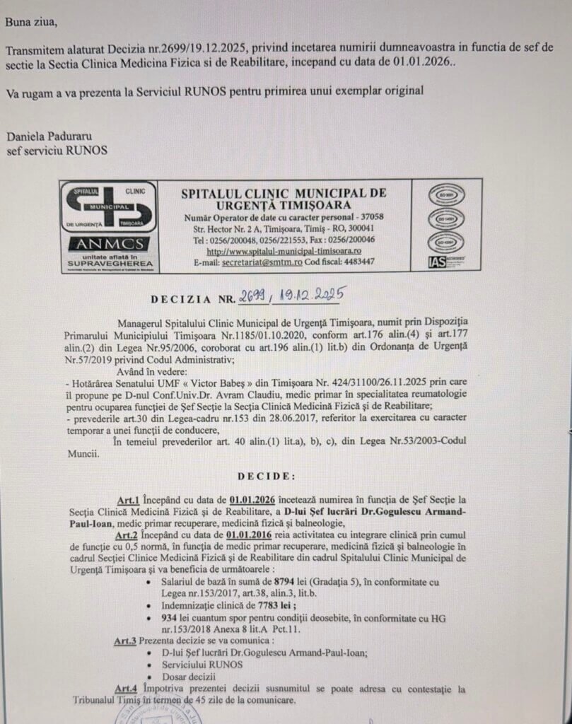 La Spitalul Clinic Municipal de Urgență Timișoara, o decizie administrativă, comunicată prin e-mail, în ajun de Anul Nou, și asumată de directorul Stela Iurciuc, a produs trei efecte majore. Și e pe cale să-l producă și pe al patrulea! În primul rând, a dus la înlocuirea abuzivă și nelegală a șefului de la Clinica de Recuperare, Medicină Fizică și Balneologie Timișoara, dr. Armand Gogulescu. Apoi, a lăsat secția fără coordonator căci, atât cel demis, cât și cel numit la butoane cu data de 1 ianuarie 2026 (dr. Claudiu Avram), ambii se aflau în concediu legal de odihnă, aprobat de managementul SCMUT. Deci, cade variata că nu s-a știut.