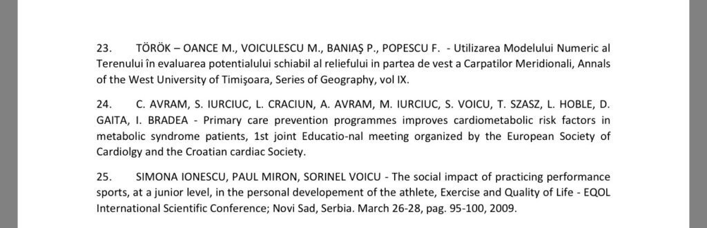 Ceea ce, în ochii legii, se numește conflict de interese sau incompatibilitate. Nu de alta, dar o analiză atentă a unei liste întregi de lucrări științifice, enumerate în CV-uri și în preambulul unui doctorat, arată, clar ca lumina zilei, că dr. Claudiu Avram, în calitate de angajat și nou șef de clinică, are o relație privilegiată cu angajatorul Stela Iurciuc. Mai exact, apar împreună, în calitate de autor sau coautor pe diverse cercetări sau proiecte comune (Dietary and physical activity counseling…, Physical activity perception…, Revascularized coronary patients… etc.) toate publicate în reviste de profil.