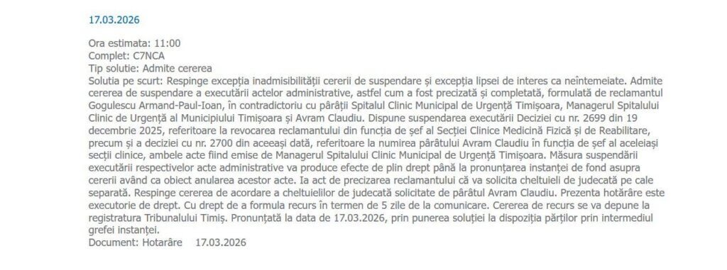 Scandalul de la Clinica de Recuperare, Medicină Fizică și de Reabilitare din Timișoara a căpătat o turnură majoră în instanță. Potrivit minutei pronunțate astăzi, 17 martie 2026, judecătorii au admis cererea formulată de dr. Armand Gogulescu și au dispus suspendarea executării actelor administrative prin care acesta a fost revocat din funcția de șef al secției, iar în locul său a fost numit dr. Claudiu Avram. Suspendarea produce efecte imediate, până la soluționarea pe fond a acțiunii în anulare, hotărârea fiind executorie.