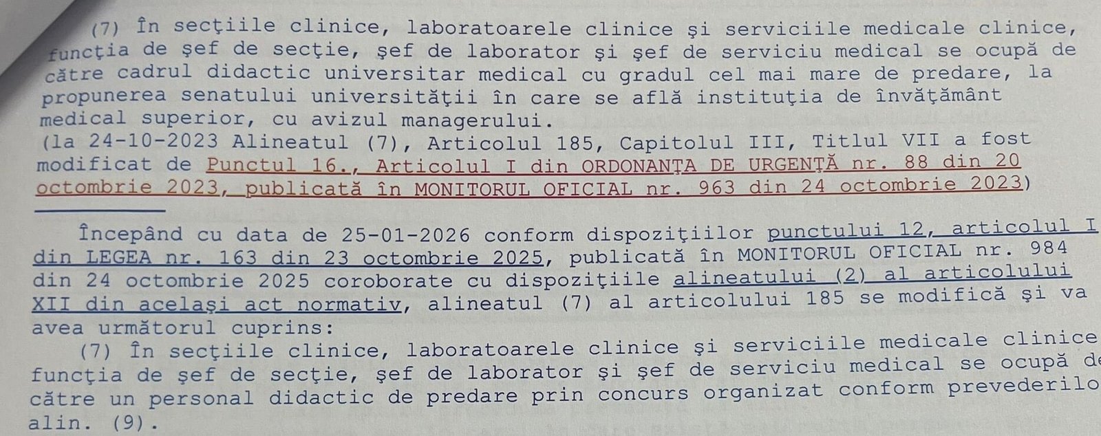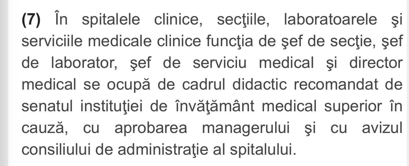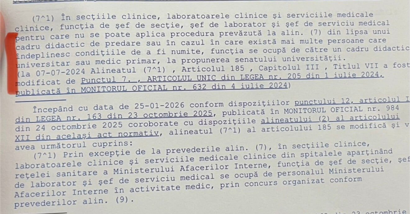 Și chestiunea e că, în realitate, pentru schimbarea de macaz de la Balneologie, spitalul NU avea nevoie de nicio decizie a consiliului de administrație. Asta pentru că Legea Sănătății a fost modificată, încă din 24 octombrie 2023, și a extras CA-ul din lanțul de decizie pentru numirile de șefi de secție. Deci, de doi ani, povestea nu mai e valabilă! Cert e că, tot atunci, a mai apărut o modificare legislativă, așa cum rezultă din Monitorul Oficial al României, la Legea Sănătății (95/2006, ART 185, aliniatul 7.1). Una extrem de interpretabilă, care zice că în secțiile clinice, funcția de șef de secție, pentru care nu se poate aplica procedura prevăzută la alin. (7 – cel mai mare în grad universitar) în cazul în care există mai multe persoane care îndeplinesc condițiile de a fi numite, funcția se ocupă de către UN cadru didactic universitar sau medic primar, la propunerea Senatului UMF.