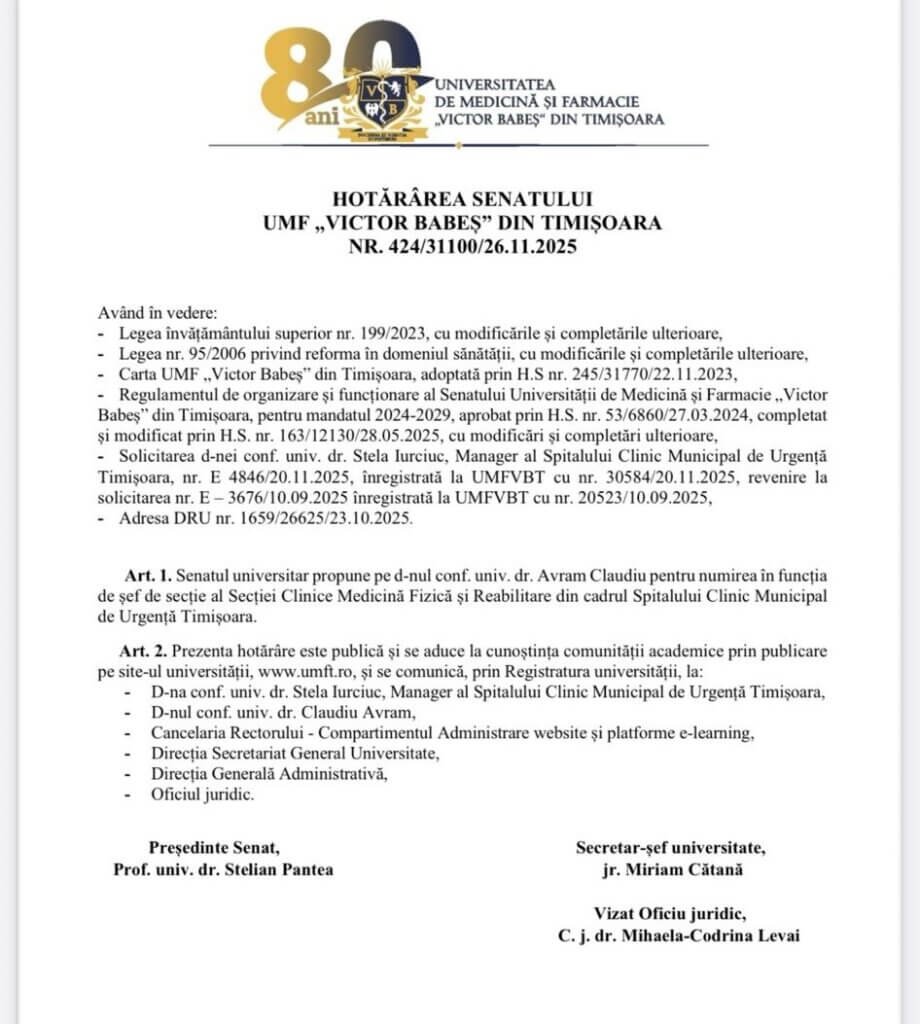 Și conform adresei DRU nr. 1361/21627 din 18 septembrie 2915 a UMF Timișoara,  în cadrul clinicii universitare Medicină fizică, balneologie și reumatologie, cadrele didactice cu gradul cel mai mare de predare sunt conf. univ. dr. Avram Claudiu, conf. univ. dr. Drăgoi Răzvan-Gabriel și conf. univ. dr. Dinu Anca. Contează mai puțin dacă doi dintre contracandidați au făcut sau nu vreo scrisoare de renunțare. Cert e că, în 26 noiembrie 2025, instituția de învățământ superior a decis în favoarea dr. Claudiu Avram. De fapt, doar l-a propus, că de avizat l-a avizat managerul SCMUT, cumătra Stela Iurciuc.