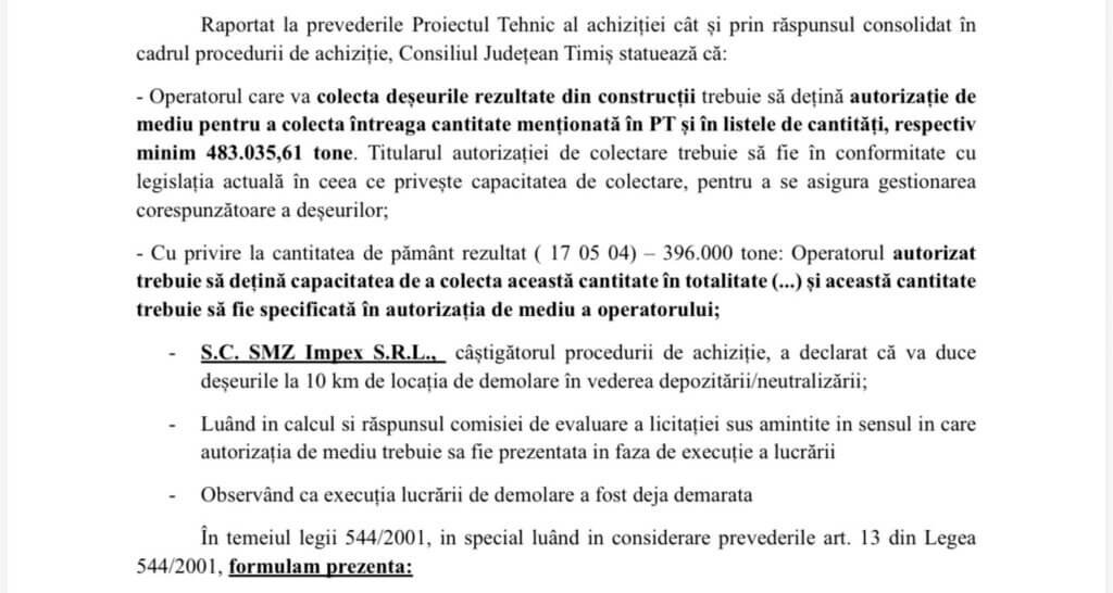 Una peste alta, în ce privește deșeurile din demolarea stadionului Dan Paltinișanu, conform legii, odată cu predarea amplasamentului de către CJ Timiș, răspunzător de traiectoria și trasabilitatea reziduurilor este SC SMZ Impex SRL. Chiar și de cele 500.000 tone de pământ rezultat din excavări! E important și asta, dar și mai semnificativ e că, odată cu începerea lucrărilor și excavațiilor, în vara anului trecut (august 2025), tot deșeul cu cod 170504 a fost încărcat în camioane. Apoi, transportat și pus la păstrare pe un teren, aflat în proprietatea celor de la Aquatim SA, situat pe raza municipiului Timișoara (CF 444504). Nu simbolic, nu experimental, ci industrial. Fără reciclare!