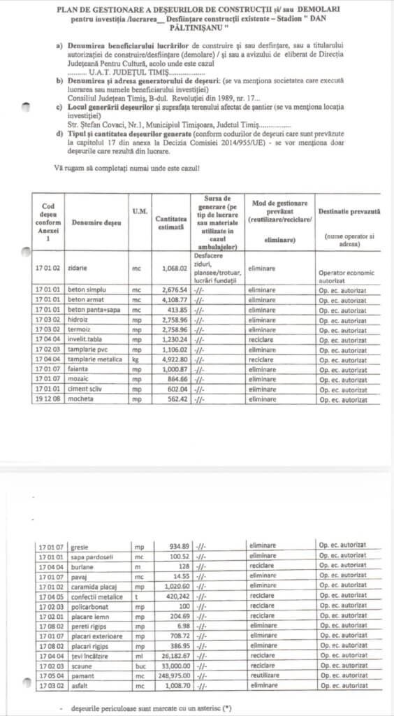 De asemenea, tot investigatorii mai spun că demolatorul avea obligații clare privind transportul și reciclarea deșeurilor, care sunt prevăzute și asumate în/prin documentația de licitație. Mai exact, societatea ar fi trebuit să ducă pământul și piatra, rezultate din demolare, la un operator autorizat, aflat la maximum 10 kilometri distanță față de stadionul Dan Păltinişanu. În realitate, spun procurorii, transporturile de deșeuri ar fi fost efectuate de operatori neautorizați, iar reziduurile ar fi fost ulterior abandonate, aruncate sau ascunse, cu încălcarea legislației de mediu.