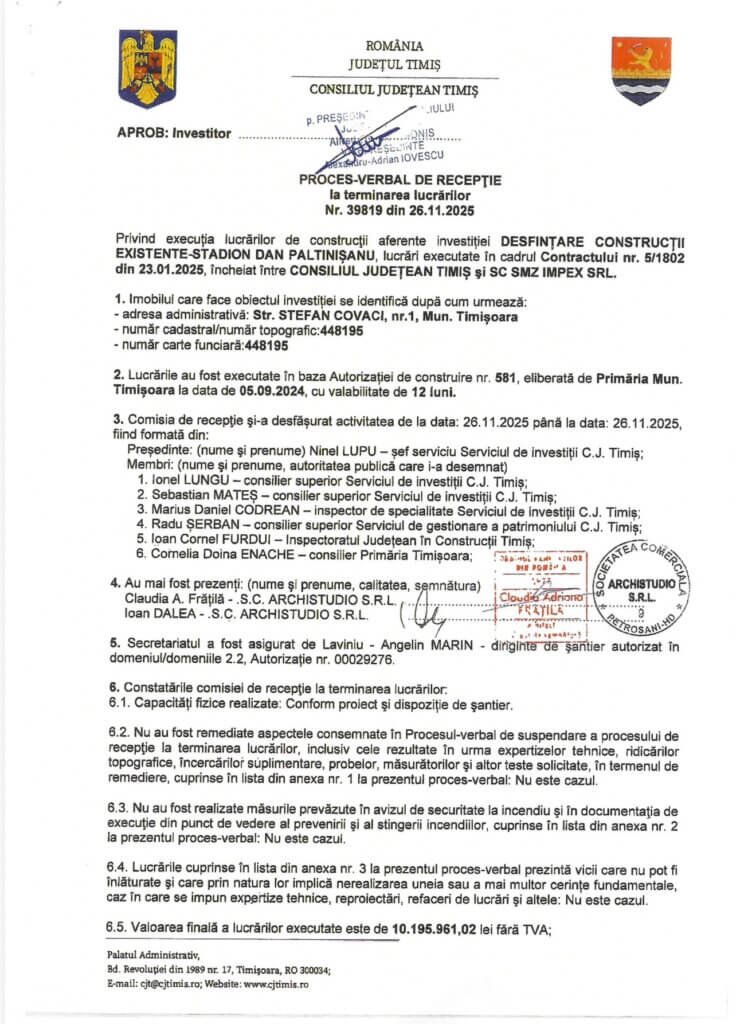 Pe hârtie, care este cea mai rezistentă materie primă din România, în ce privește dărâmarea arenei sportive de pe Bega, lucrurile sunt aproape impecabile. Există avize, există firme, există trasee. Există chiar și pământ! Singurul lucru care lipsește, în schimb, este valoarea lui. În documente, sute de mii de tone întregi de material sunt evaluate la 0 lei, probabil dintr-o modestie excesivă a pieței sau dintr-o profundă criză existențială a contabilității românești. Ceea ce demonstrează că, dacă în natură există lanțuri trofice, în Timiș, există lanțuri logistice. Exact așa este și circuitul rebuturilor, care provin din demolarea fostului stadion de fotbal al Politehnicii.