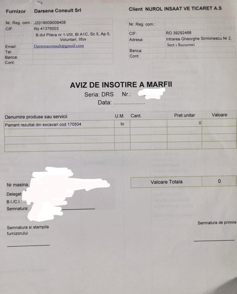 Traducerea exactă a trasabilității deșeurilor, în special a celor provenite din demolarea stadionului Dan Paltinișanu, o găsiți mai jos, într-un aviz de însoțire a mărfii, care are la rubrica furnizor pe SC Darena Consult SRL din Voluntari, iar la client pe turcii de la Nurol. Tot acolo, apare și denumirea materialului transportat – pământ rezultat din excavări cod 170504. Adică, conform legii, deșeu. În rest, zero preț unitar, zero cantitate transportată și zero valoare. De precizat că documentul a fost ridicat de la șoferul unei autoutilitare (B-904-PXP) cu remorcă (TM-40-PXP), chiar la ieșire de pe arena sportivă, de un echipaj de Poliție, la un control de rutină, care a avut loc pe 29 august 2025.