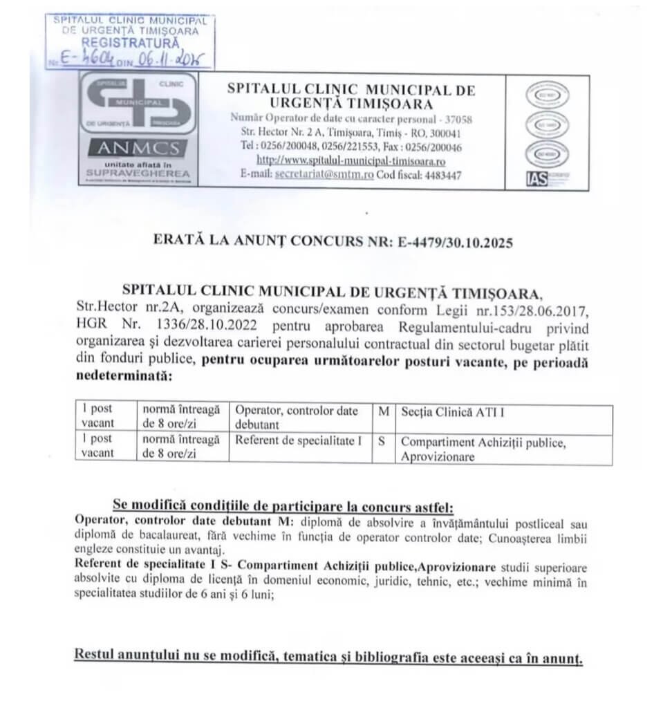 • 6 noiembrie 2025 – erată la anunțul de concurs