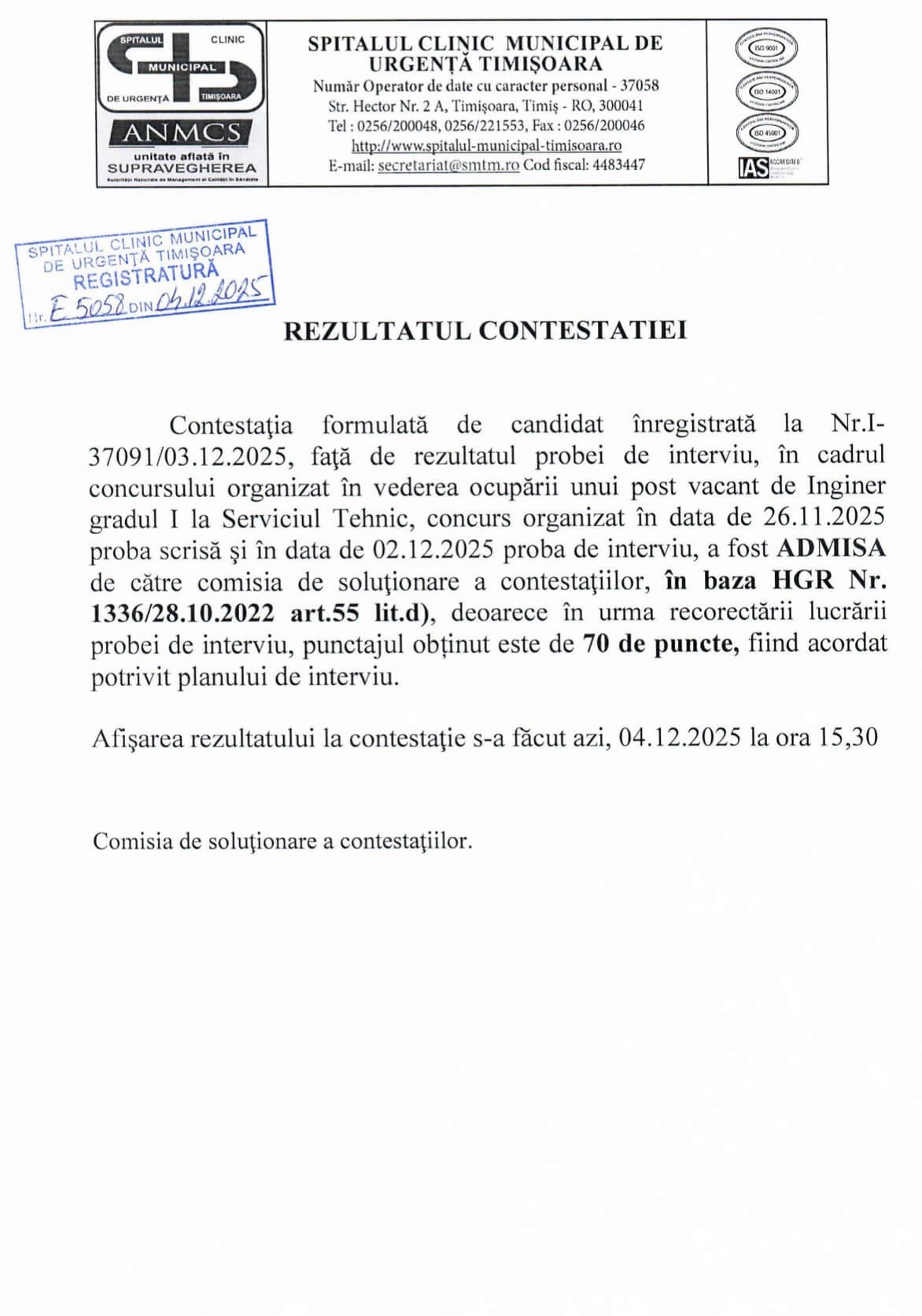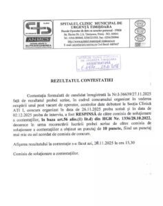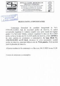 Și nu e primul examen anulat, care, inițial, a fost înțesat de erate și contestații. Ca, în final, să fie desființat definitiv și reluat, la o dată ulterioară. Cu siguranță, nu e nici ultimul! E suficient să vă uitați doar în ultima săptămână, pe anunțurile publice de concurs, postate pe pagina SCMUT, ca să vă realizați că profesionalismul continuă! De exemplu, cum e examenul pentru postul de biochimist, publicat pe data de 27 noiembrie 2025, care vine la pachet, după o săptămână, cu o erată, aruncată în online pe data 4 decembrie a.c. Și mai dați o privire și pe contestația admisă, după recorectare (tot pe 4 decembrie ac), pentru un post de inginer la Serviciul Tehnic! Sau pe erata pentru concursul de medic primar ATI (10 decembrie). Răzbate competența de la SCMUT, prin toți porii!