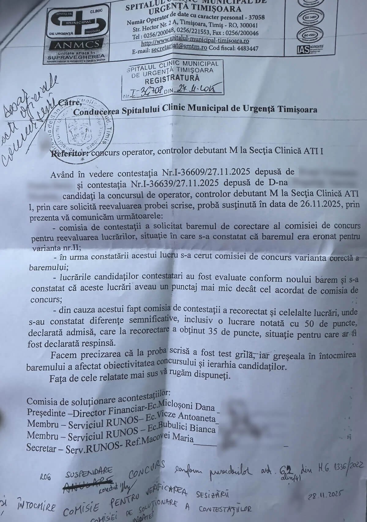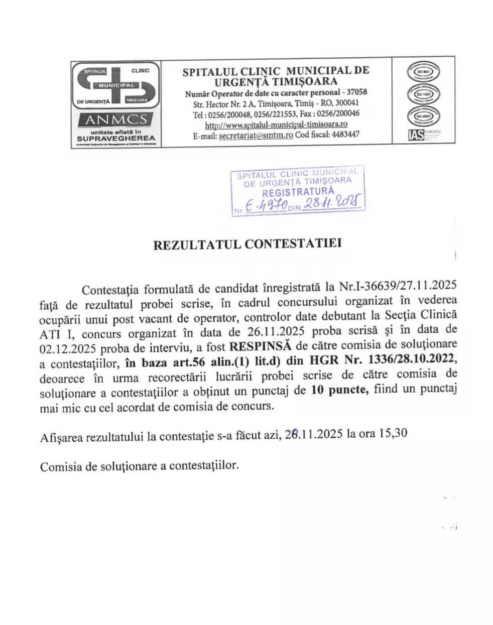 Inițial, a doua zi, pe 28 noiembrie 2025, Spitalul Clinic Municipal de Urgență Timișoara a făcut două lucruri. În primul rând, a respins ambele constestații, la proba scrisă. Apoi, printr-o decizie managerială a anunțat suspendarea concursului, până la verificarea acuzațiilor de fraudă. Iată, pe scurt, motivele halucinante, așa cum rezultă acestea din raportul comisiei de soluționare a contestațiilor, intrată în posesia InsiderTM: