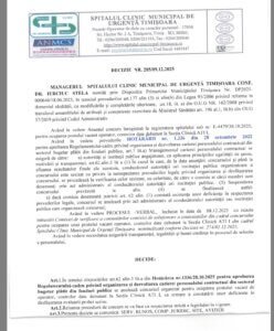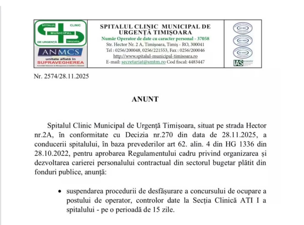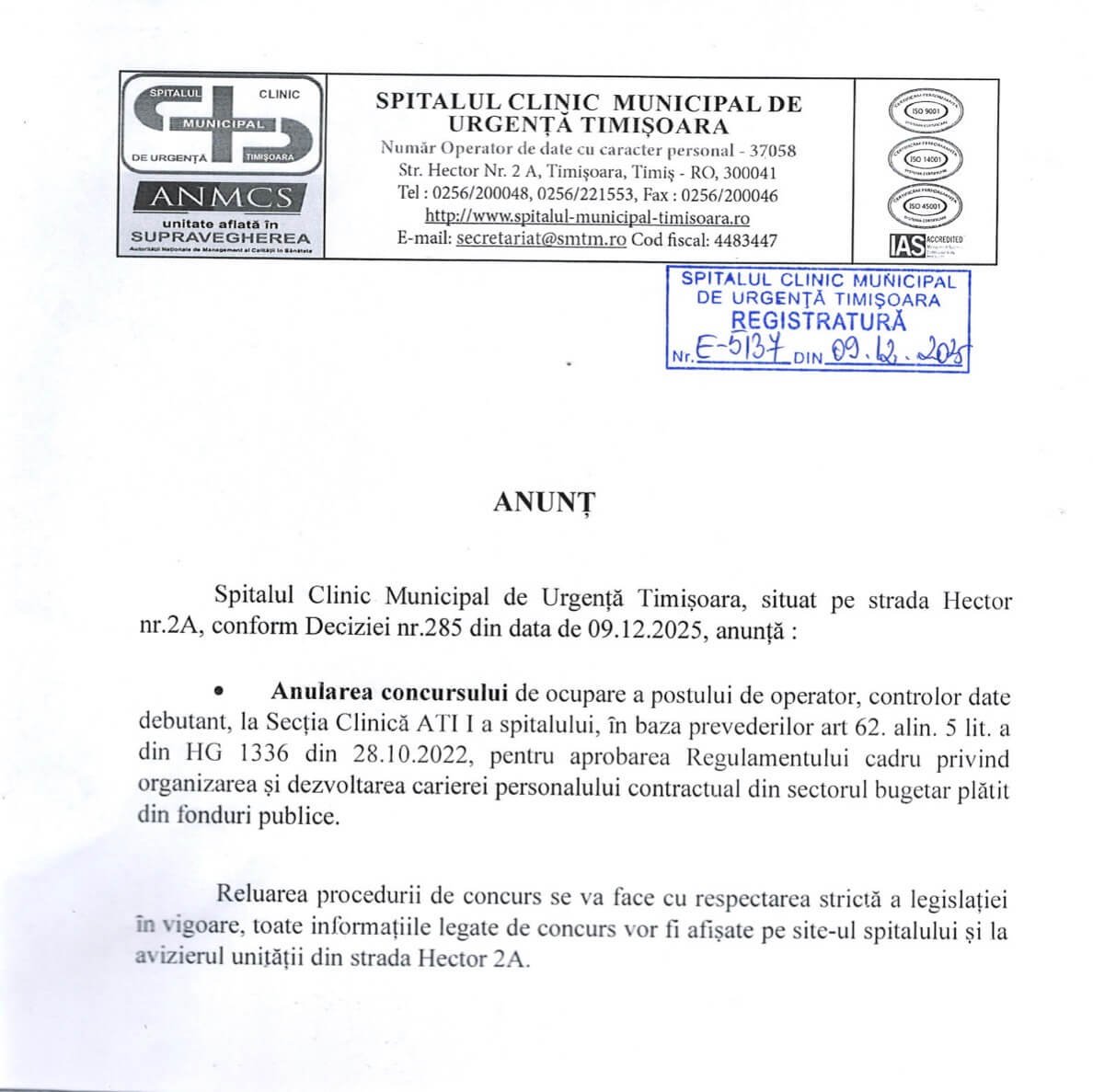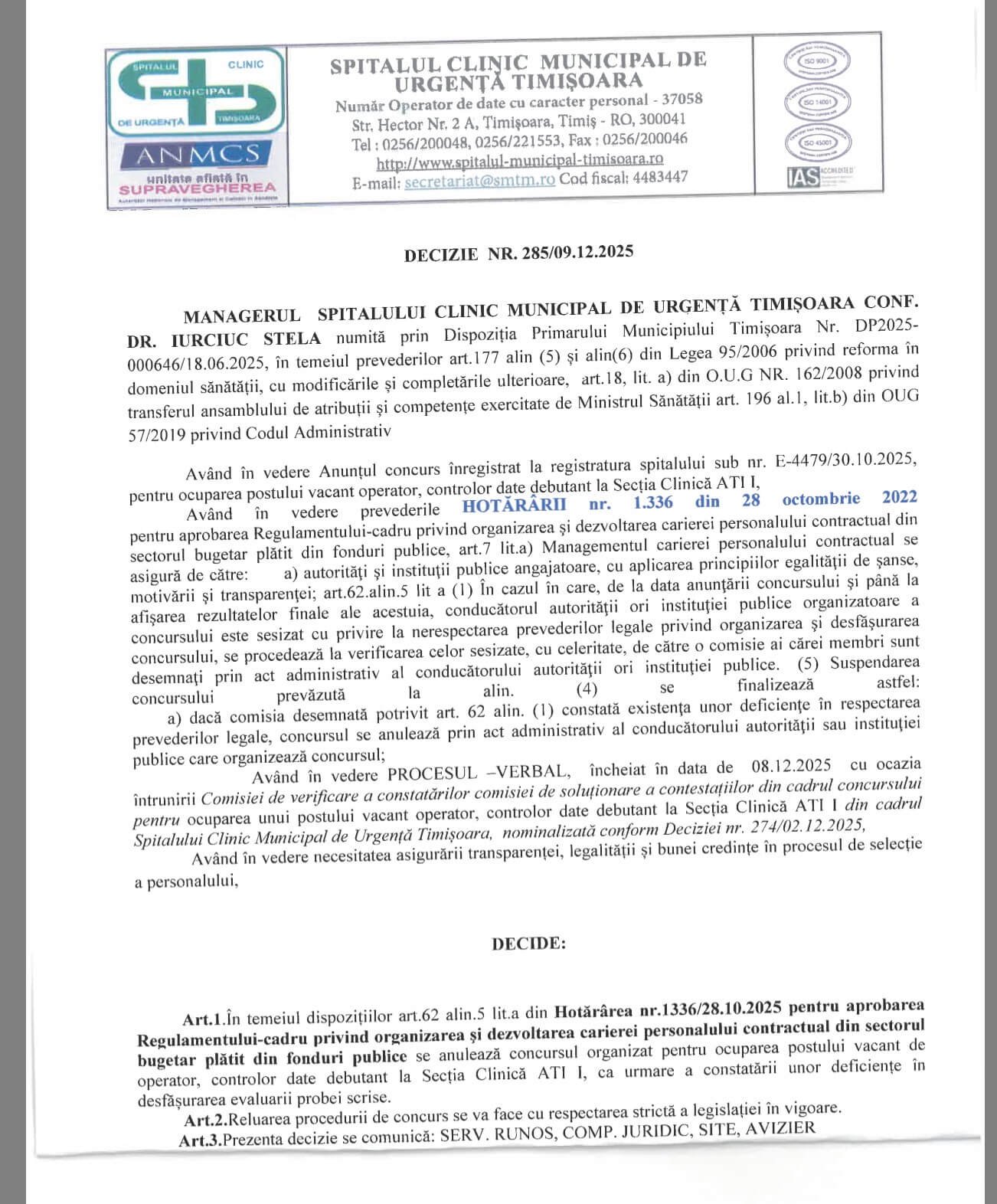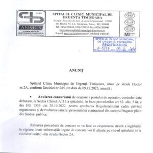 Așa că, după toate chinurile facerii, care au debutat odată cu publicarea anunțului (30 octombrie), ieri, pe 9 decembrie 2025, prin decizie managerială, SCMUT s-a autodeclarat învins și depășit de situație, indiferent cât a încercat să redreseze barca, doar ca să o mențină, pe linia de plutire, examenul pentru ocuparea unui simplu post de operator calculator! Practic, după o perioadă lungă de cugetare și suspendare, spitalul a anunțat anularea integrală a concursului! Pe vicii grave de blat și profesionalism, dar fără să recunoască asta public, decât printre rânduri, pe documente din circuitul intern!