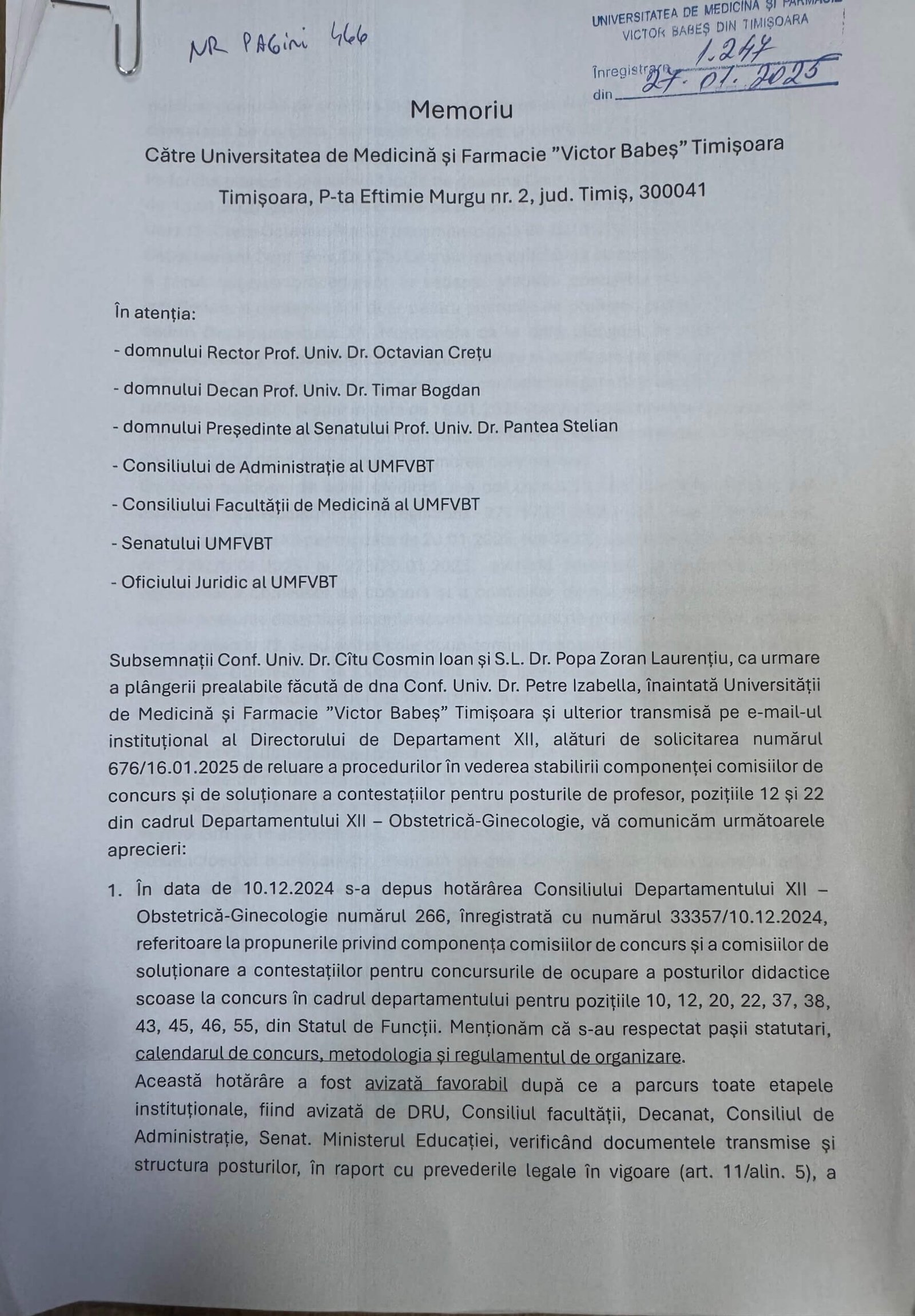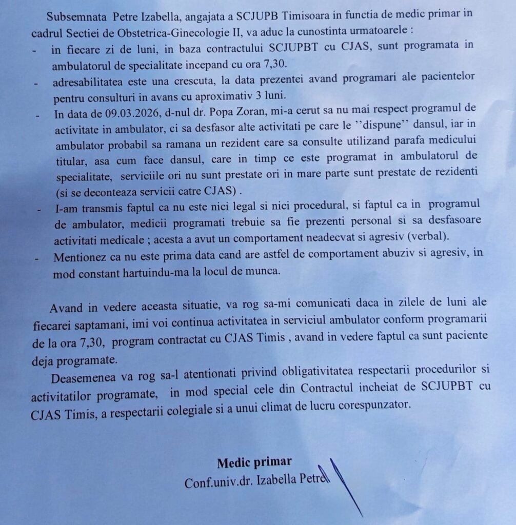 Documentul care a aprins fitilul a fost depus la registratura SCJUT, pe data de 10 martie 2026, și a fost adresat managerului unității spitalicești, prof. univ. dr. Dorel Săndesc, și directorului medical, Andreea Rață. În petiție, Izabella Petre reclamă presiuni din partea prof. dr, Zoran Popa, șeful Secției de Obstetrică-Ginecologie II, care i-ar fi cerut să nu își respecte programul de lucru din ambulatoriu, stabilit prin contractul spitalului cu CJAS Timiș: