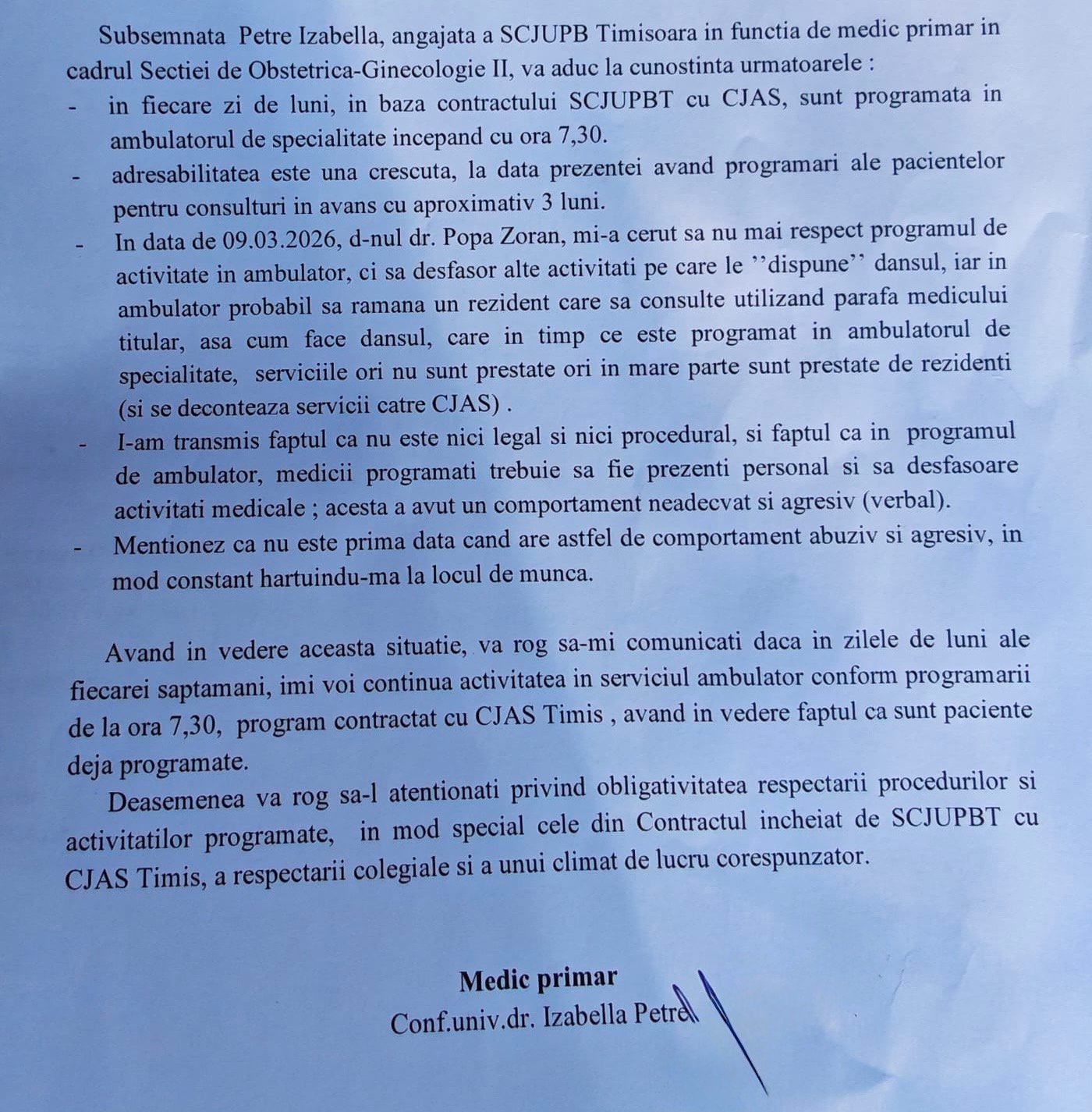 În data de 09.03.2026, d-nul dr. Popa Zoran mi-a cerut să nu mai respect programul de activitate în ambulator, ci să desfășor alte activități pe care le dispune dansul, iar acolo probabil să rămână un rezident care să consulte, utilizand parafa medicului titular, așa cum face dânsul, care, în timp ce este programat în ambulatorul de specialitate, serviciile ori nu sunt prestate ori în mare parte sunt efectuate de rezidenți. I-am transmis faptul că nu este nici legal și nici procedural, și faptul că, în programul de ambulator, medicii programați trebuie să fie prezenți personal și să desfășoare activități medicale…