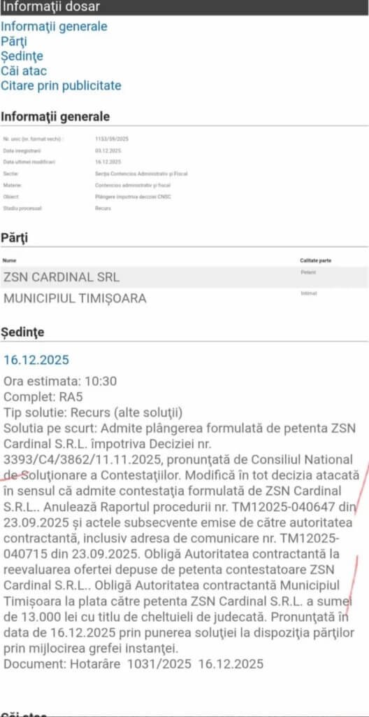 A doua zi, pe 12 decembrie 2025, primarul Dominic Fritz comunică pe Facebook, chiar de la piciorul podului Iuliu Maniu, că a început reabilitarea obiectivului și că lucrările, în valoare de 8 milioane de euro, sunt programate să dureze, până în februarie 2027. Ca, în final, la patru zile după, pe 16 decembrie 2025, Curtea de Apel Timișoara să admită recursul formulat de SC ZSN Cardinal SRL. Și nu doar că judecătorii au pronunțat o hotărâre definitivă, cu efecte radicale asupra procedurii, ci au și anulat în întregime decizia CNSC. Apoi, au cerut desființarea tuturor actelor subsecvente, inclusiv a adresei de comunicare a rezultatului și, nu în ultimul rând, obligarea Primăriei Timișoara la reevaluarea ofertei ZSN Cardinal SRL.