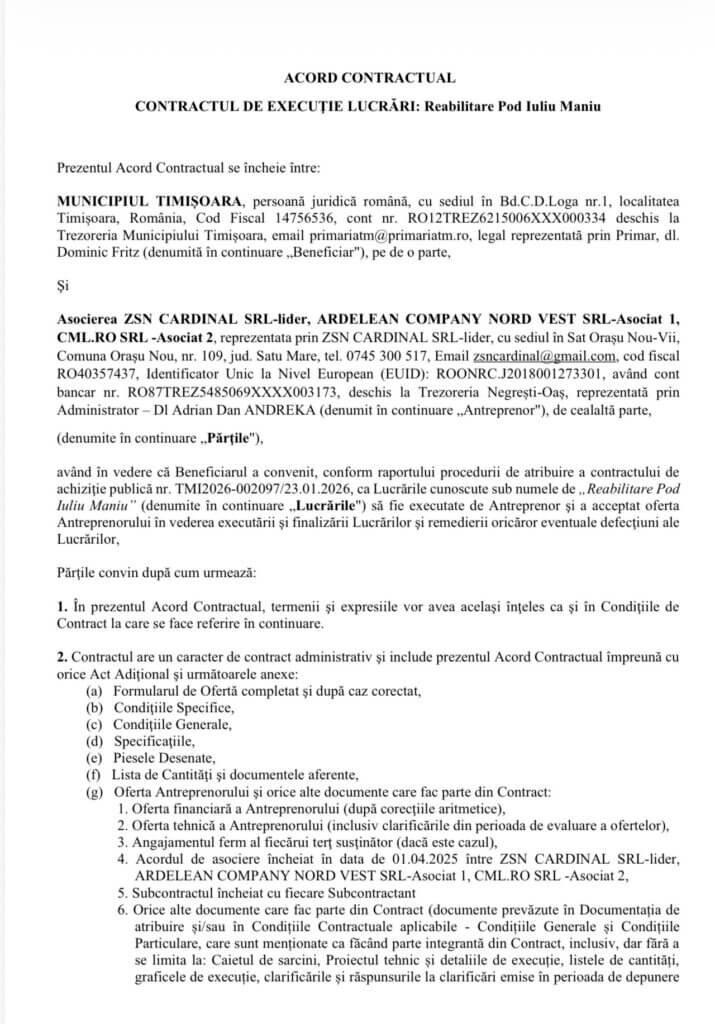 Așadar, ceea ce nu spune Primăria Timișoara este că, pe burtă, ce a fost semnat și anunțat public în perioada 11-12 decembrie 2025, ca urmare a deciziei instanței (16 decembrie), a fost reluat, în regim de urgență, la început de ianuarie 2026. Și, așa cum rezultă din documente, pe 23 ianuarie a.c, conform procedurii de atribuire a contractului de achiziție publică (nr. TMI2026-002097), lucrările pentru reabilitarea podului Iuliu Maniu au ajuns la SC ZSN Cardinal SRL. Suma cu care a fost câștigată licitația e de 30,4 milioane lei plus TVA, cu precizarea că șantierul trebuie închis în 14 luni de la data semnării contractului.