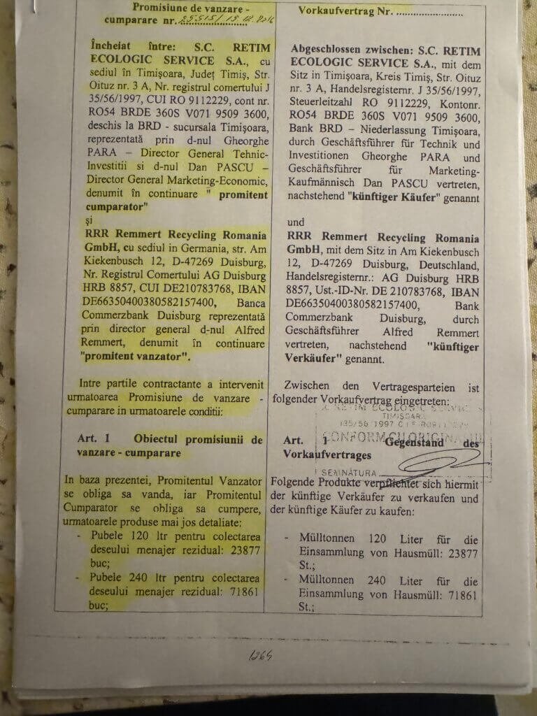 Așa că, într-un exces de transparență și seriozitate germană, ca să convingă comisia de licitație de bunele sale intenții, în cursa pentru colectarea deșeurilor din zona metropolitană, RETIM a pus pe masa celor de la ADID un document din care rezultă că tomberoanele fuseseră deja (semi)antamate. Mai exact, printr-un antecontract de vânzare-cumpărare, evident. încheiat cu… RRR Remmert Recycling România GmbH. Da, exact societatea care majoritară în SC RER Timișoara SRL, partenera administrației lui Dominic Fritz:
