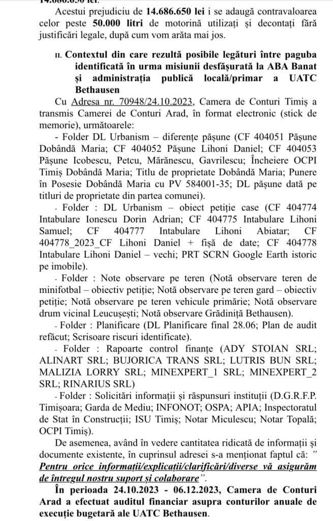 Și povestea a mers (mult) mai departe. Nu oricum, ci etapizat, exact ca într-un adevărat thriller politic. Pe scurt, după răscoala din 21 martie 2023 și reclamația primarului Ioan Lihoni, auditul de la Primăria Bethausen a fost suspendat. Ulterior, s-a decis ca verificările să fie făcute de Camera de Conturi Arad care, conform documentelor, a demarat procedura pe 24 octombrie 2023 și a încheiat-o șase săptămâni mai târziu, în luna decembrie a aceluiași an. Cum altfel decât în aplauze și cu amenzi de buzunar, una de 5.000 de lei pentru administrația locală și alta de 1.000 de lei, scrisă pe numele primarului de la PSD.