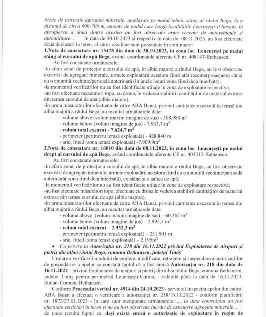 Referitor la exploatarea ilicită de extracție agregate minerale în albia majoră a râului Bega, pe teritoriul comunei Bethausen, respectiv controalele de specialitate ale GNM din data de 28.03.2023 și din perioada 03.04.2023 – 05.04.2023, au fost identificate 4 locații (pe terenul C F 408147-Bethausen) cu suprafețe cuprinse între aproximativ 70 mp și 6.000 mp, în care s-au desfăşurat activități ilicite de extracție agregate minerale, amplasate pe malul tehnic stâng al râului Bega, la o distanță d e circa 600-700 m, amonte de podul care leagă localitățile Leucuşeşti și Susani. În apropierea a două dintre acestea au fost observate urme recente de autovehicule și autoutilitare….