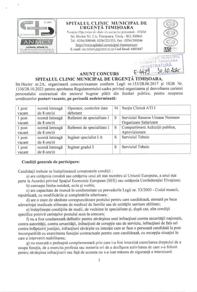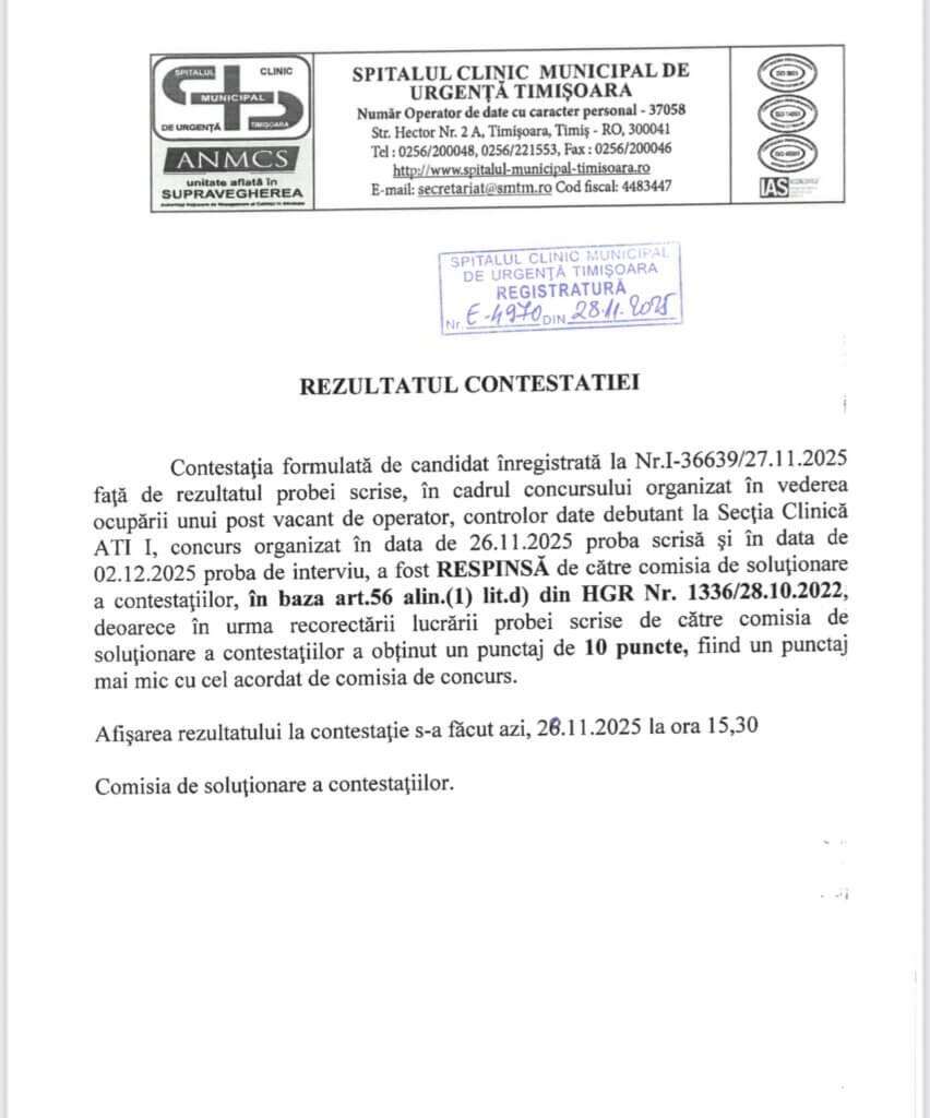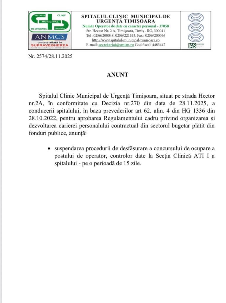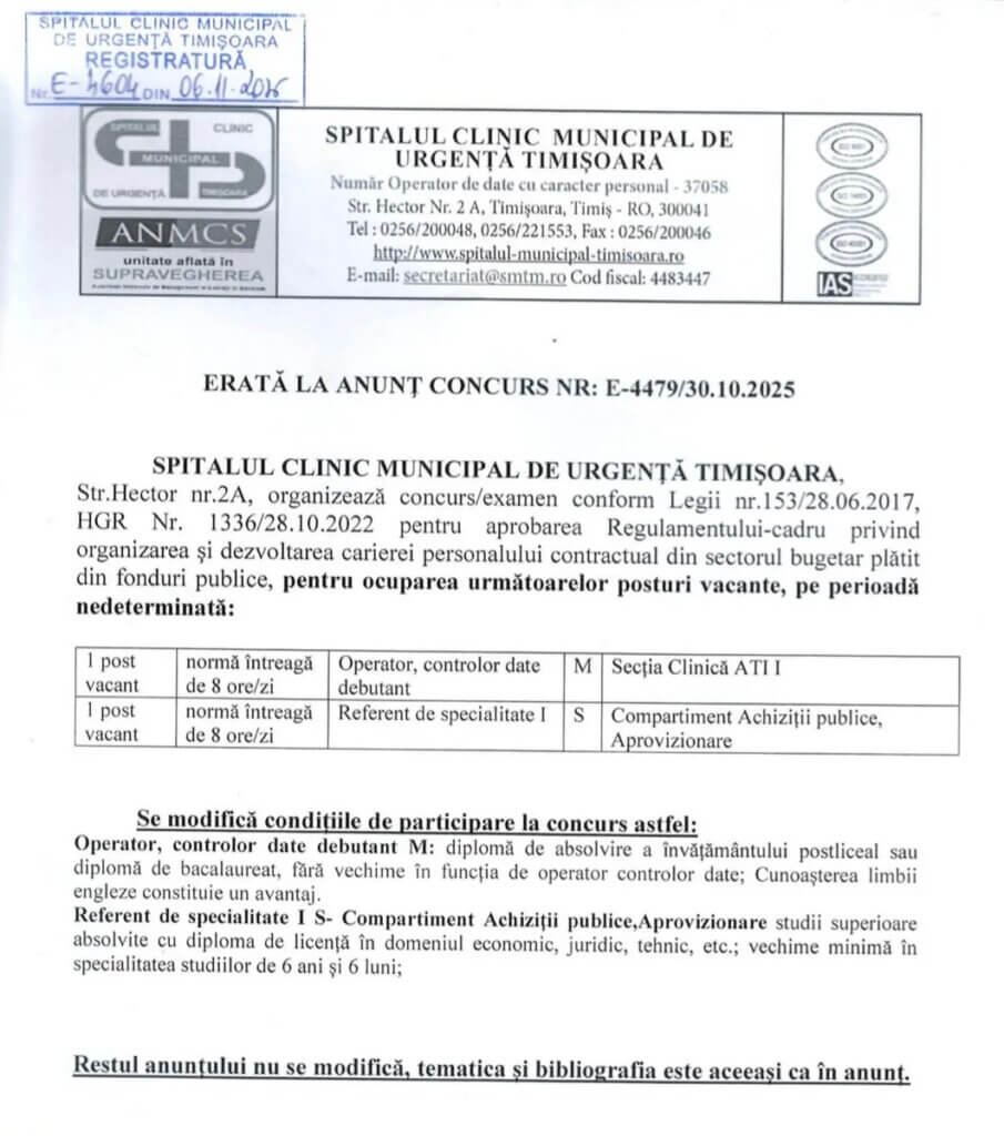 Acum, în ce privește organizarea de examene pe post, documentele interne cu antet și semnătura de SCMUT, puse cap la cap, arată nu doar o crasă neglijență, ci o mașinărie birocratică ridicată pe improvizație, aroganță, combinație și dispreț față de lege. Și, atenție, de aici începe pelicula! Da, exact, cu un anunț de concurs, publicat pe 30 octombrie 2025. Pe scurt, cinci posturi, reguli clare, termen scurt, aer de profesionalism. Cu cerințe scrise, ca să nu se califice nimeni, decât cine trebuie. Azi, rămânem doar pe postul de operator controlor date debutant de pe secția ATI a Spitalului Clinic Municipal de Urgență Timișoara.